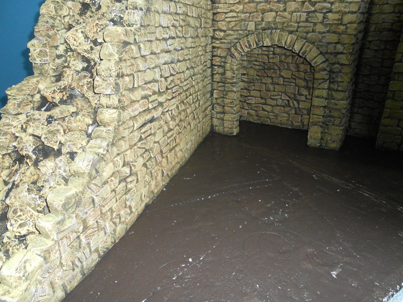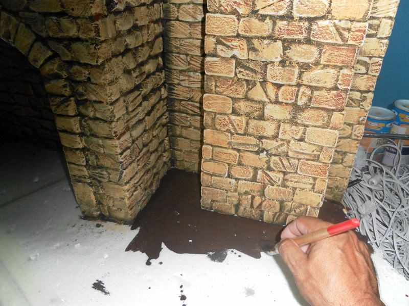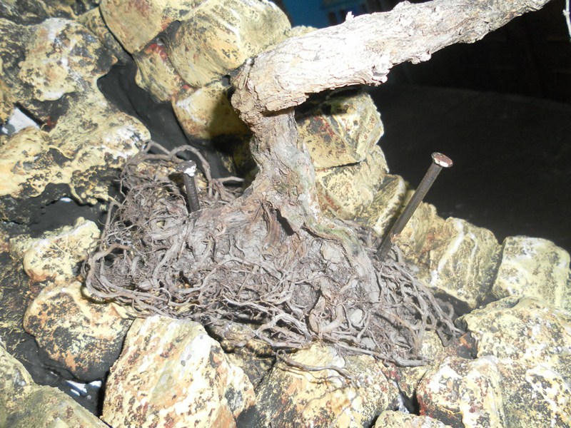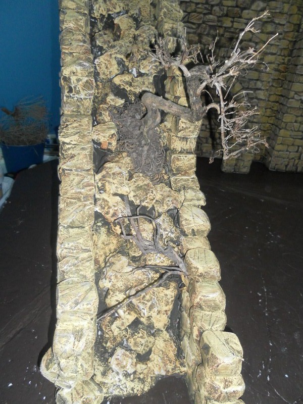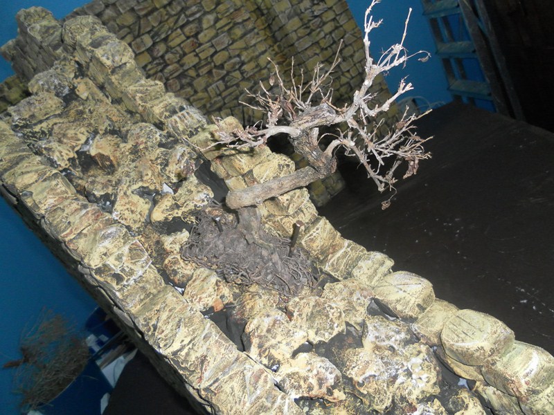 Mientras seca, voy poniendo un arbol en la parte derruida de la muralla (7), el cual no quiero pegar para que me silva para otras ocasiones, lo cojo con dos clavos que hundire en las raices (8), y dejara fijo al arbol ,solo que aun no esta terminado, se le tendra que poner la parte de las hojas casi al final. Se le pone tambien un trozo de raiz , haciendo creer que sale de entre las piedras y que viene del arbol (9).