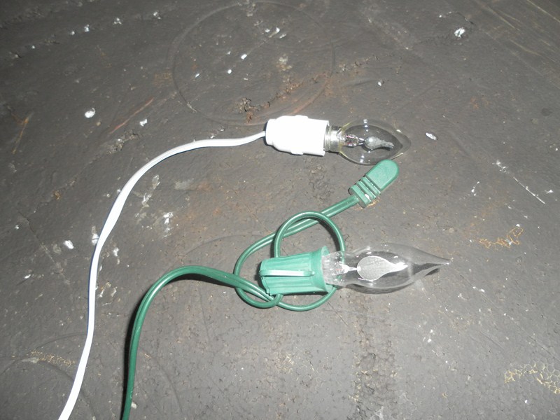 Con un cuter se habre un agugero en el lugar donde va la hoguera (4),en el que tiene que caber una de estas dos bombillas (5), que deve quedar un poco saliente del agugero,con estas bombillan no hay que tener cuidado ya que no se calientan. Se introduce el cable por debajo (6).