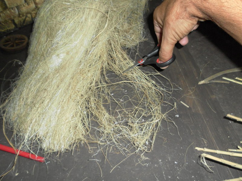 Lo siguiente es comprado, es estopa normal (4), que la pico con una tigera, y la huso como paja para el suelo, hay estopa que es nueva y es muy blanca, para oscurecerla se humedece y se pone al sol, asi queda rubia como la paja.