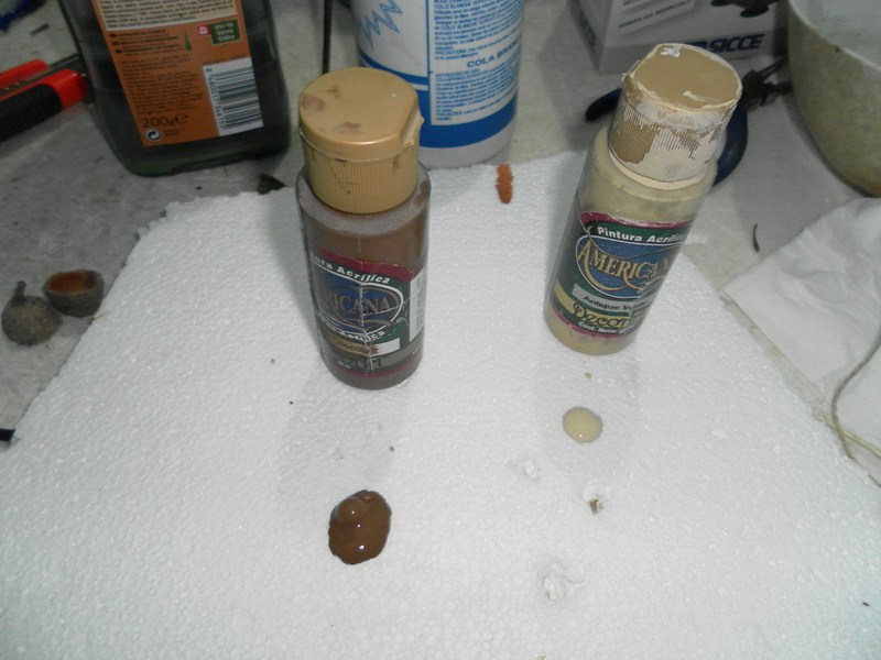 Con marron chocolate y blanco sucio (15), se saca un marron oscuro, y se guarrea la tela(16), que ya esta seca y rigida, y luego con albero (17), con marron chocolate se pinta la reja (18), y se imita los chorreones de oxido en la pared (19), al llagar a los chorreones que saltan del pretil, se utiliza los dedos resfregando (20), y con marron chocolate y blanco sucio se le da unos reflejos a la reja (21).