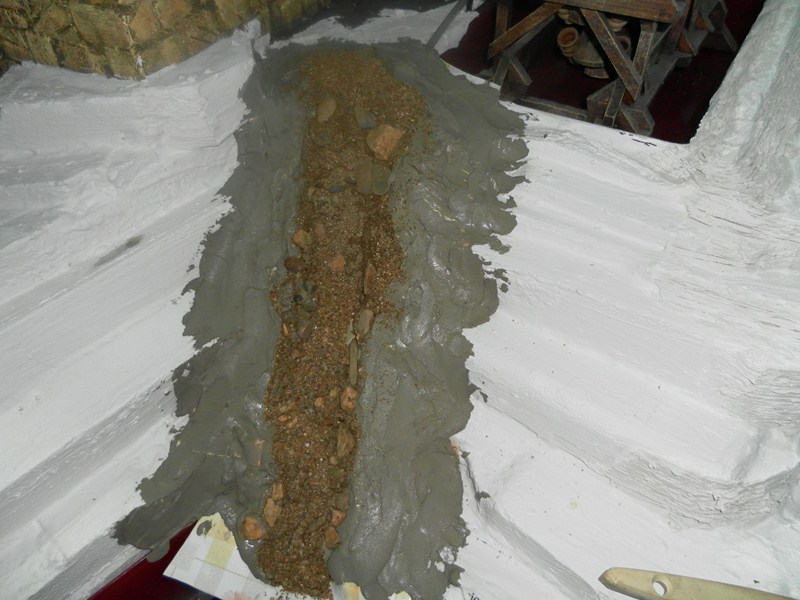 Sobre el hule ,la madera y la masa, aun fresco, se pone el otro hule y se rellene con mas masa ,dando la forma definitiva al cauce (14), con arena de rio ,se llena el cauce con gran cantidad, y se aprieta con las manos, y se coloca unas piedras por el contorno (15).
