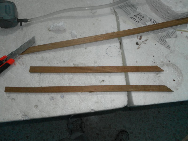 De un hule entelado (7), se cortan dos trozos iguales y que sobre pase lo que pretendo hacer de cauce, (pongo hule entelado, por que es mas resistente a golpes y girones, y se adapta mejor al cauce que le haga), tambien cortamos dos maderas que haran el cauce (8).