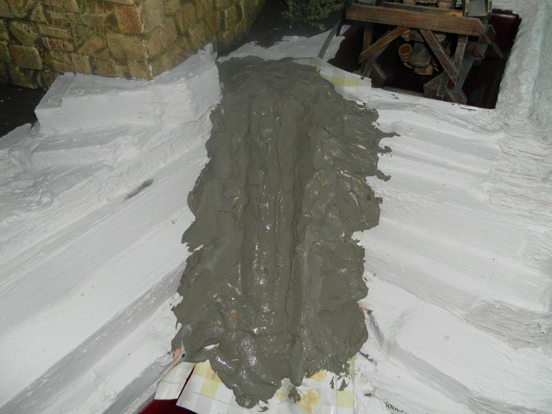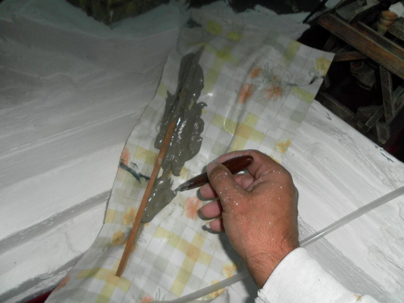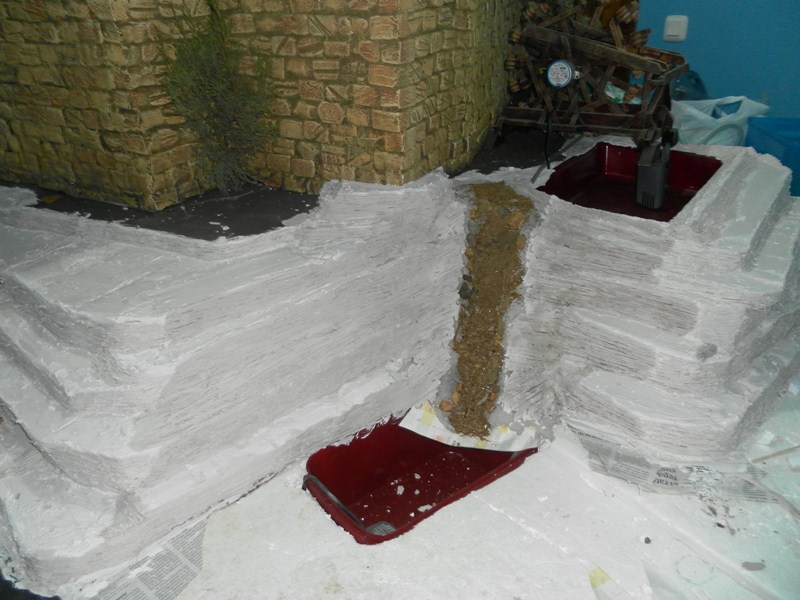Sobre el hule ,la madera y la masa, aun fresco, se pone el otro hule y se rellene con mas masa ,dando la forma definitiva al cauce (14), con arena de rio ,se llena el cauce con gran cantidad, y se aprieta con las manos, y se coloca unas piedras por el contorno (15).