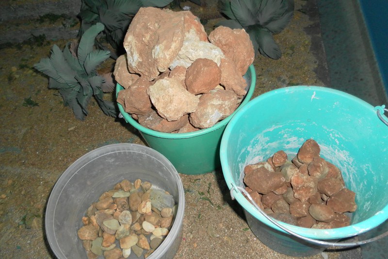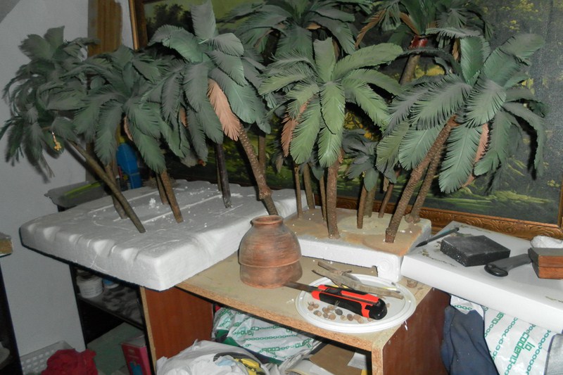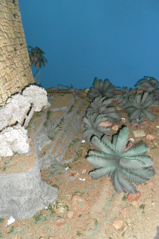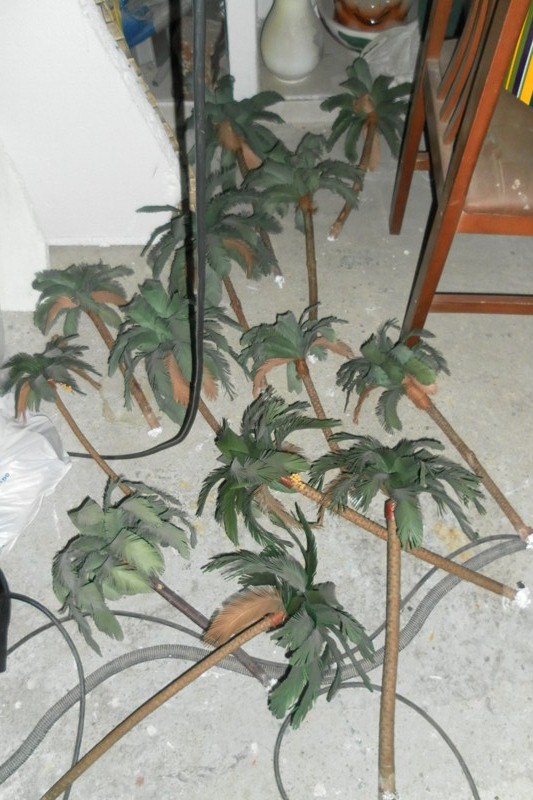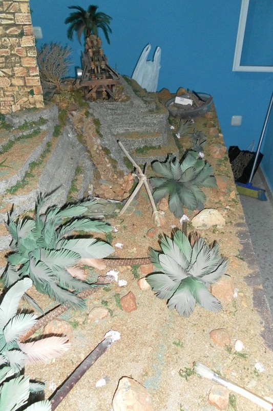 He seguido quitando el belen del año pasado, (que pena), ahora le ha tocado a las palmeras y a las pitas (1)(2)(3), y luego las preparo, quitando la silicona con un cuter, que ha servido para mantenerlo depie (4), y se colocan en una base de porex pinchadas (5), donde se queda hasta que se buelva a utilizar, asi como el arbol (6), luego en cubos se separan las piedras mas grandes (7), que se puede bolver a utilizar.