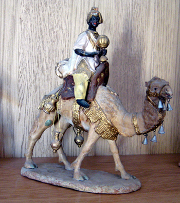 Se trata de un rey a camello en terracotta con unos añadidos de pasamanerías en dorado y engarces metálicos de los que cuelgan ofrendas y una especie de cascabeles ó campanillas.