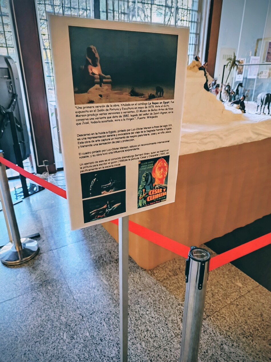 Como ya he ido adelantando, el hilo conductor tanto del Belén principal como de los montajes de las naves laterales será La Huida a Egipto , abordada en sus distintas variantes iconográficas. La propuesta se inspira en el cuadro El Descanso en la Huida a Egipto , pintado por Luc-Olivier Merson, una obra cargada de simbolismo, silencio y tránsito.