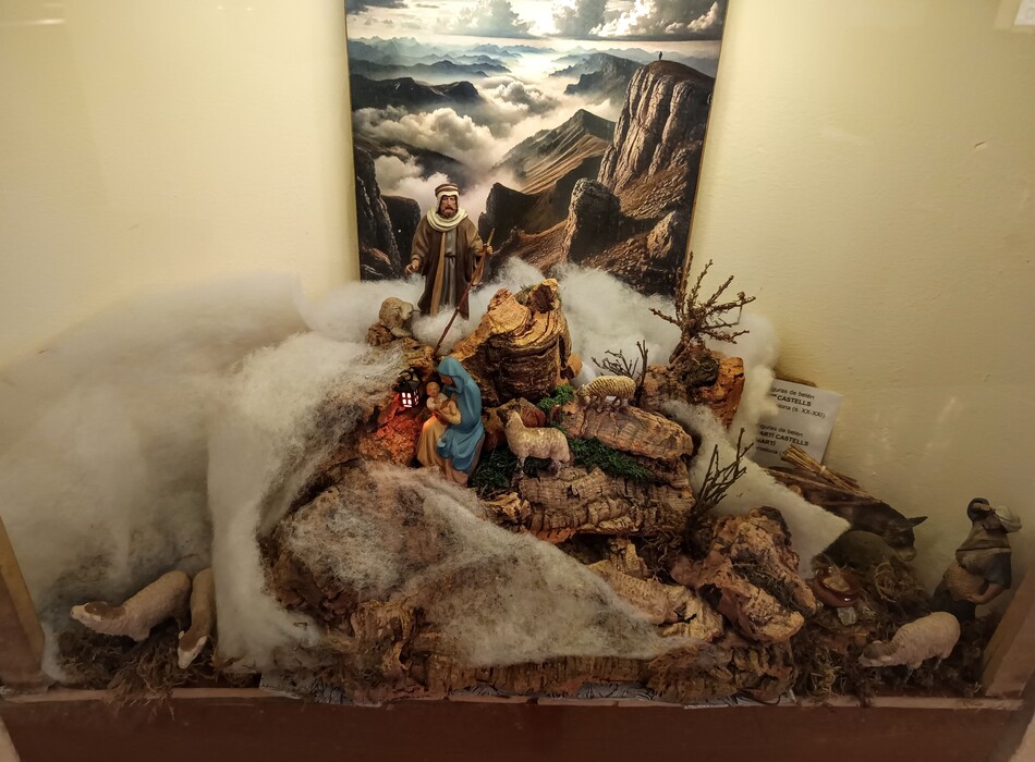 En la balda inferior se expone un pequeño diorama tipo cofre con figuras de aproximadamente 2 cm., también un nacimiento, reyes, y un pastor adorando, de 4,5 cm de tamaño de Josep Bofill Herrero.