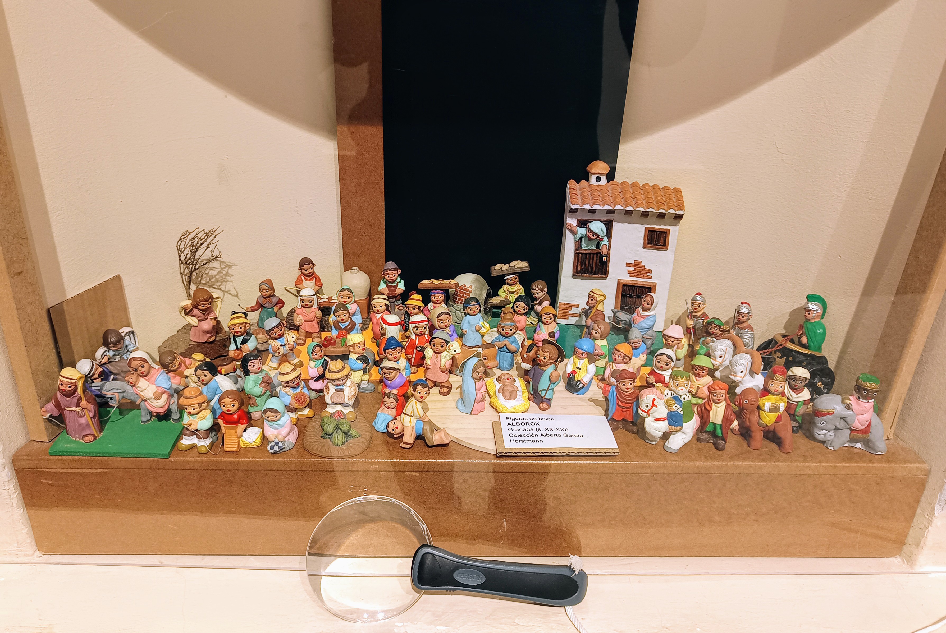 En la balda inferior se expone un belén casi completo —nacimiento, reyes, anunciación a los pastores...— con figuras de 4 cm del taller Ortigas.