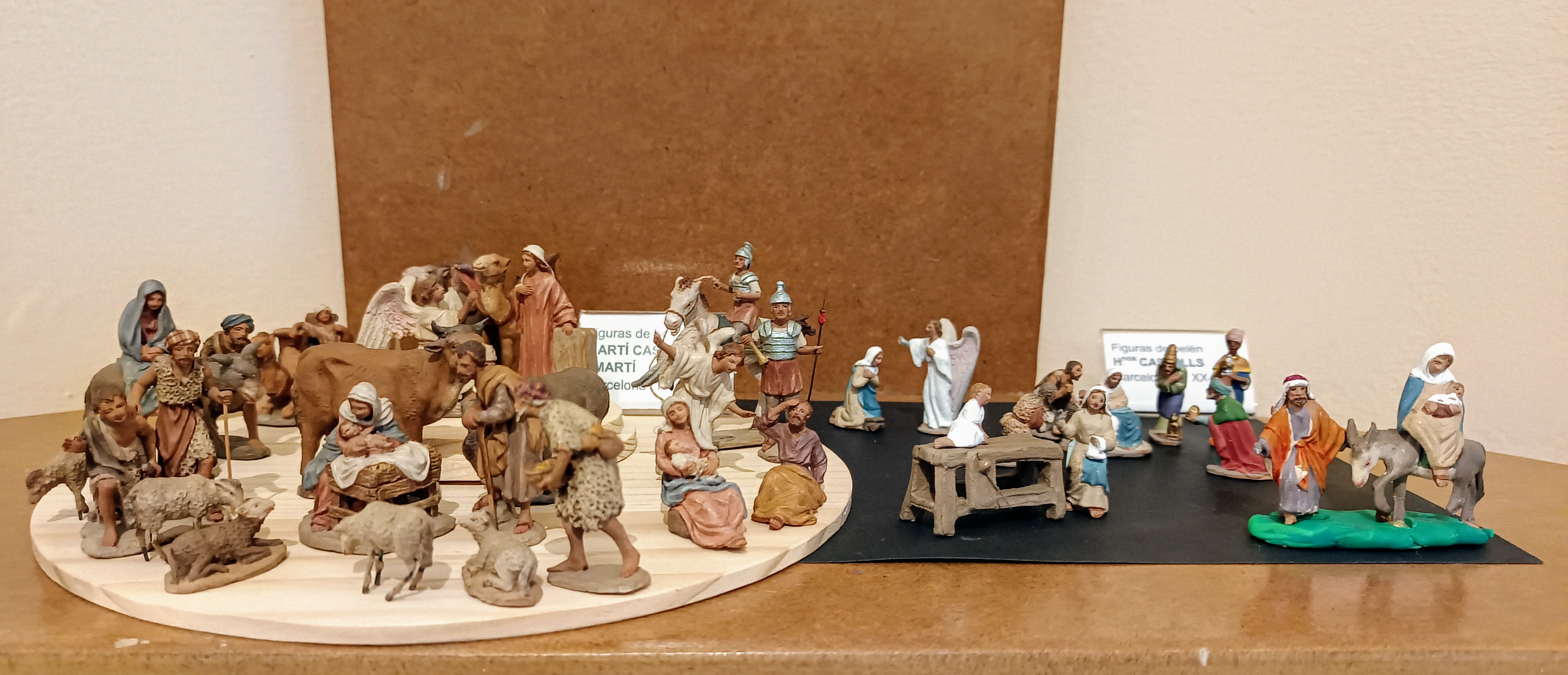 De vuelta a la exposición Miniaturas de Figuras del Belén: El Arte en lo Minúsculo , os comparto varias imágenes de otra de las hornacinas: en la balda superior se exhiben figuras de Prats y los Bertran, y en la inferior, obras de diversos autores, tanto populares como menos conocidos. En el centro de la balda inferior destaca un pequeño ángel de Salvatore, que actúa como eje visual de la composición.