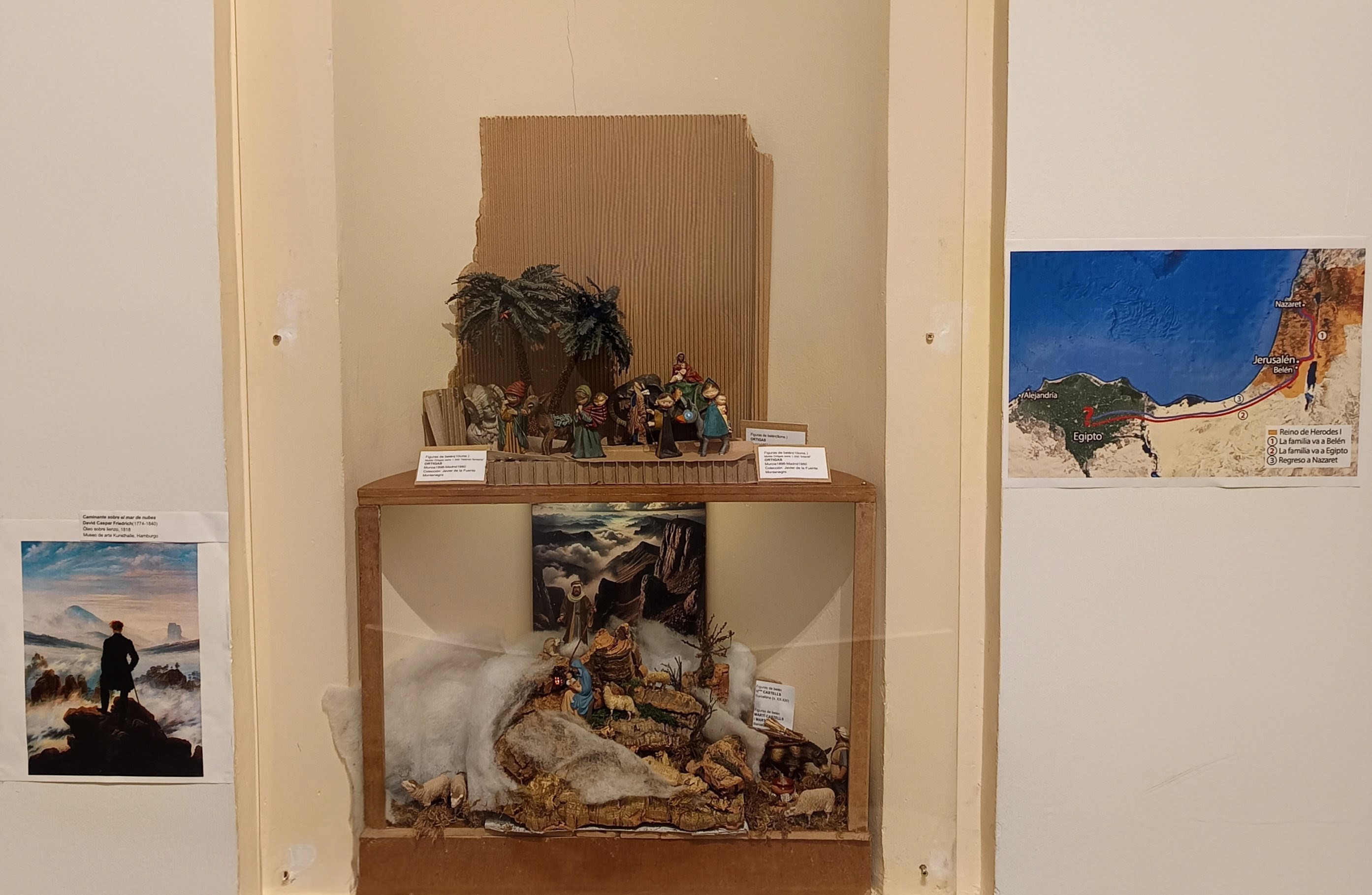 El germen de esta idea —como algunos ya sabéis por otros hilos— no podía ser otro que el belén casero de 2024, titulado Nómada. En él se establecía un diálogo con El caminante sobre el mar de nubes de Friedrich, a modo de homenaje a la figura del pastor que protagonizó los belenes de la Parroquia el pasado año. Aquel Belén Nómada viajó de Las Palmas a Madrid, recorrió la capital y terminó reposando junto a su “homónimo” en la iglesia, cerrando así un ciclo físico y simbólico.