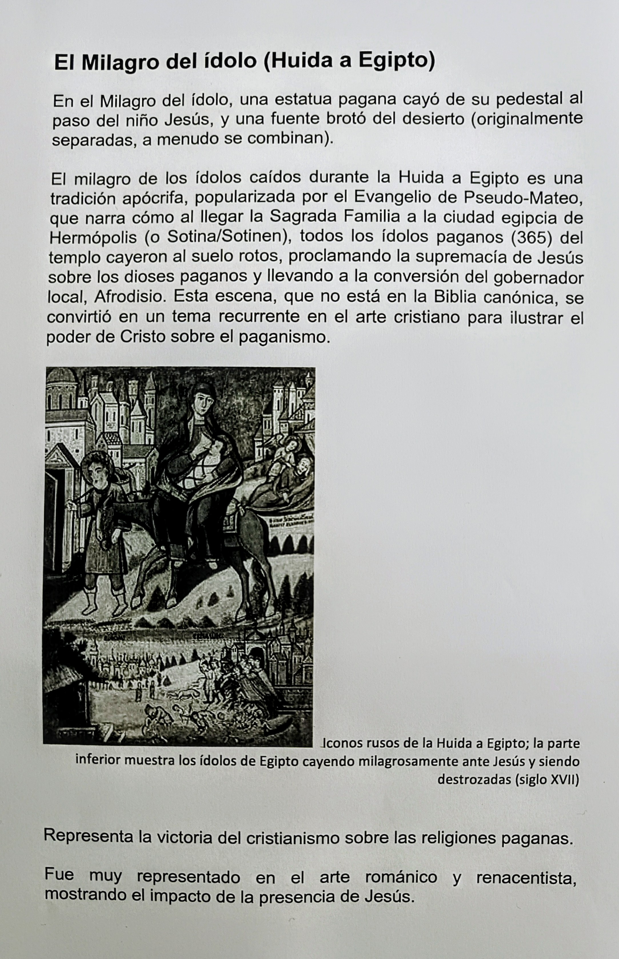 Existen varios milagros apócrifos en torno a la Huida a Egipto, y aquí reimaginamos uno de los más evocadores: el milagro del ídolo que cae ante el paso del Niño.