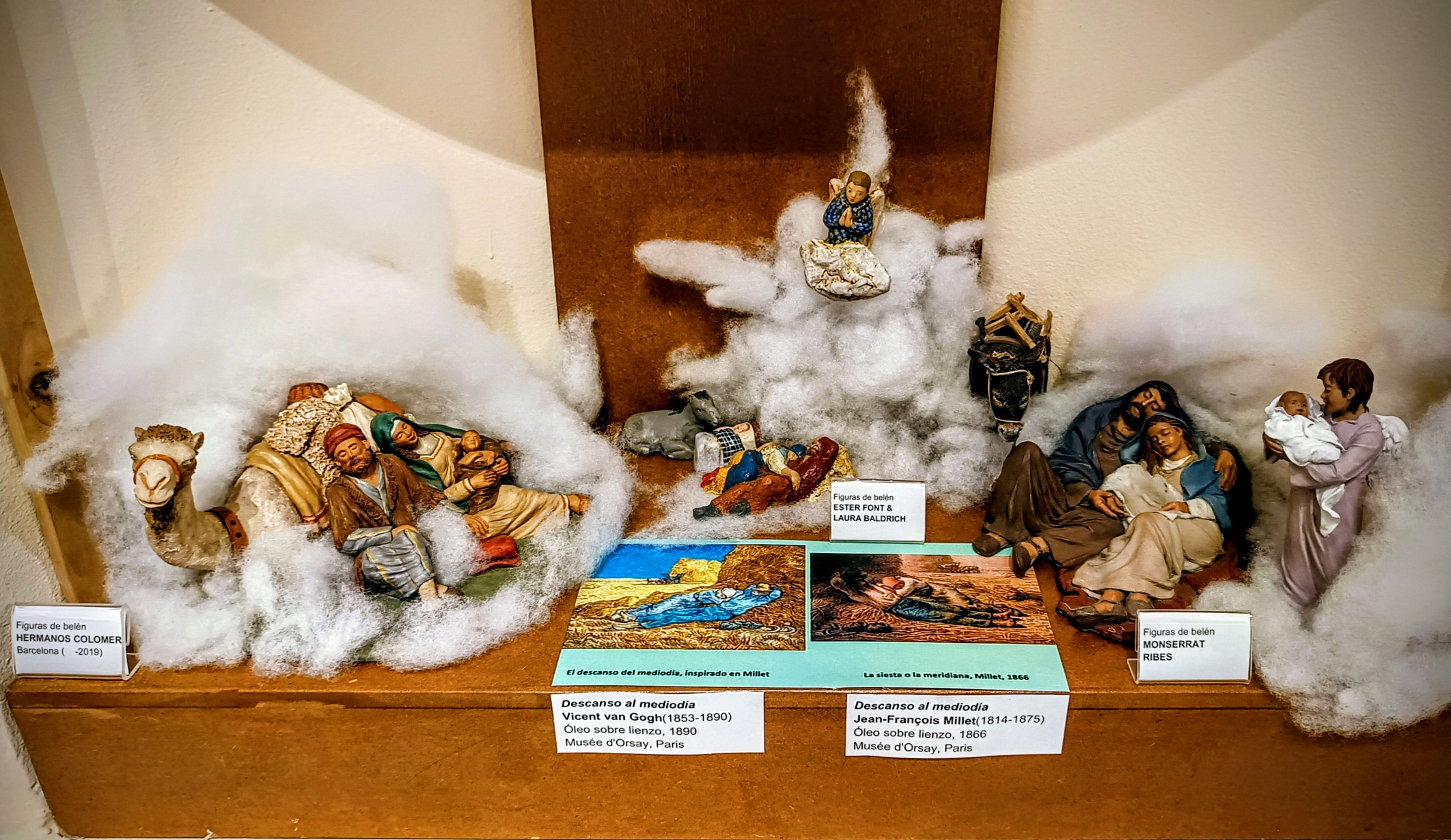 Cierro la segunda hornacina con la balda inferior, donde se representa la parte más onírica del descanso de la Sagrada Familia. En este caso tomo como referencia dos obras de arte de dos grandes pintores franceses. Porque, cuando el agotamiento pesa… ¿cuál es el descanso más placentero? La siesta.