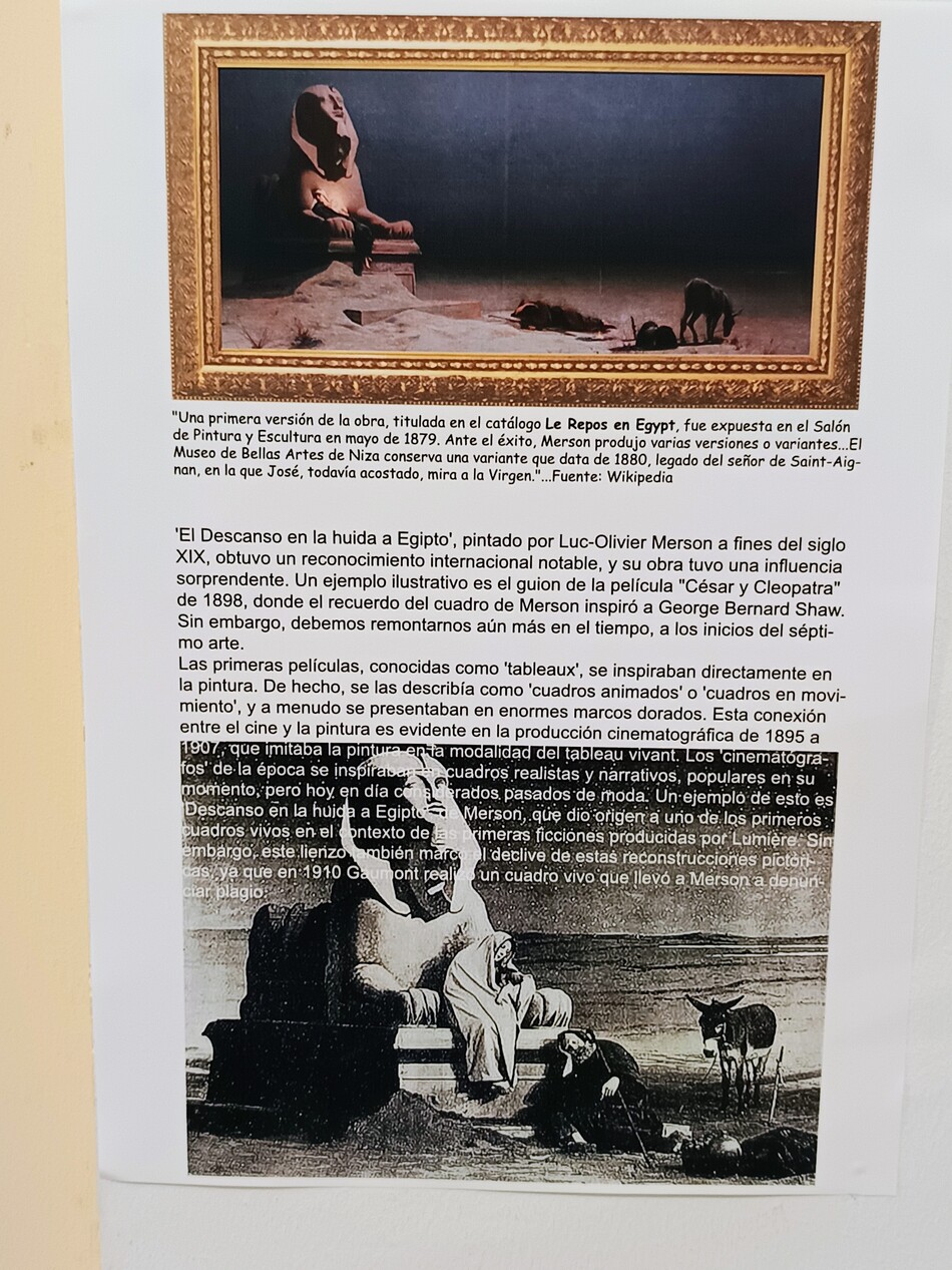 Este pequeño belén recrea un “fotograma” del episodio de la película La Natividad (Louis Feuillade, Gaumont, 1910), inspirado a su vez en el descanso de la Huida a Egipto pintado por Merson. Todo ello ya lo he ido comentando en otros hilos y también está explicado en la cartelería para los visitantes y feligreses.