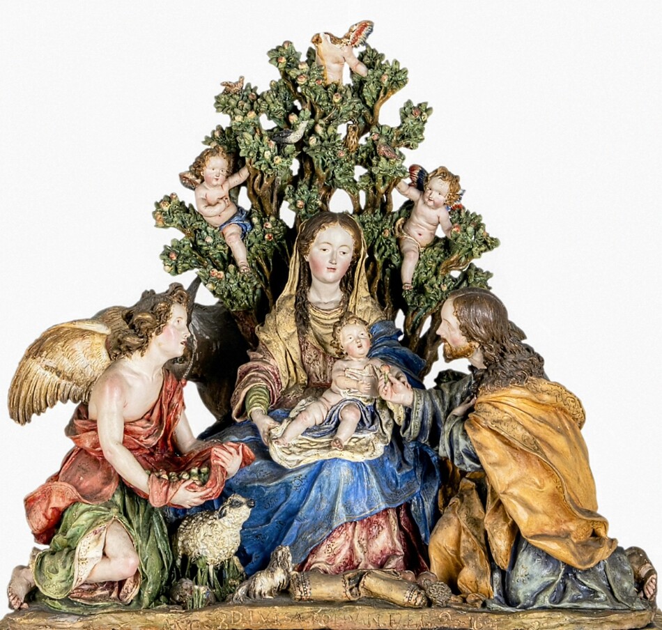 Solo un apunte: tal como indica el texto del Museo del Prado, se menciona un árbol como fondo del conjunto . Sin embargo —y quizá porque aún no se ha estudiado con el detenimiento iconográfico que merece—, lo que representa claramente es el Milagro de la palmera , en el momento posterior que se inclina para ofrecer sus dátiles durante el reposo de la Sagrada Familia. Basta observar los angelotes entre los frutos: un ángel, a la izquierda, ya ha recogido un manto lleno de dátiles, mientras San José ofrece uno al Niño Jesús, extasiado por el hambre.