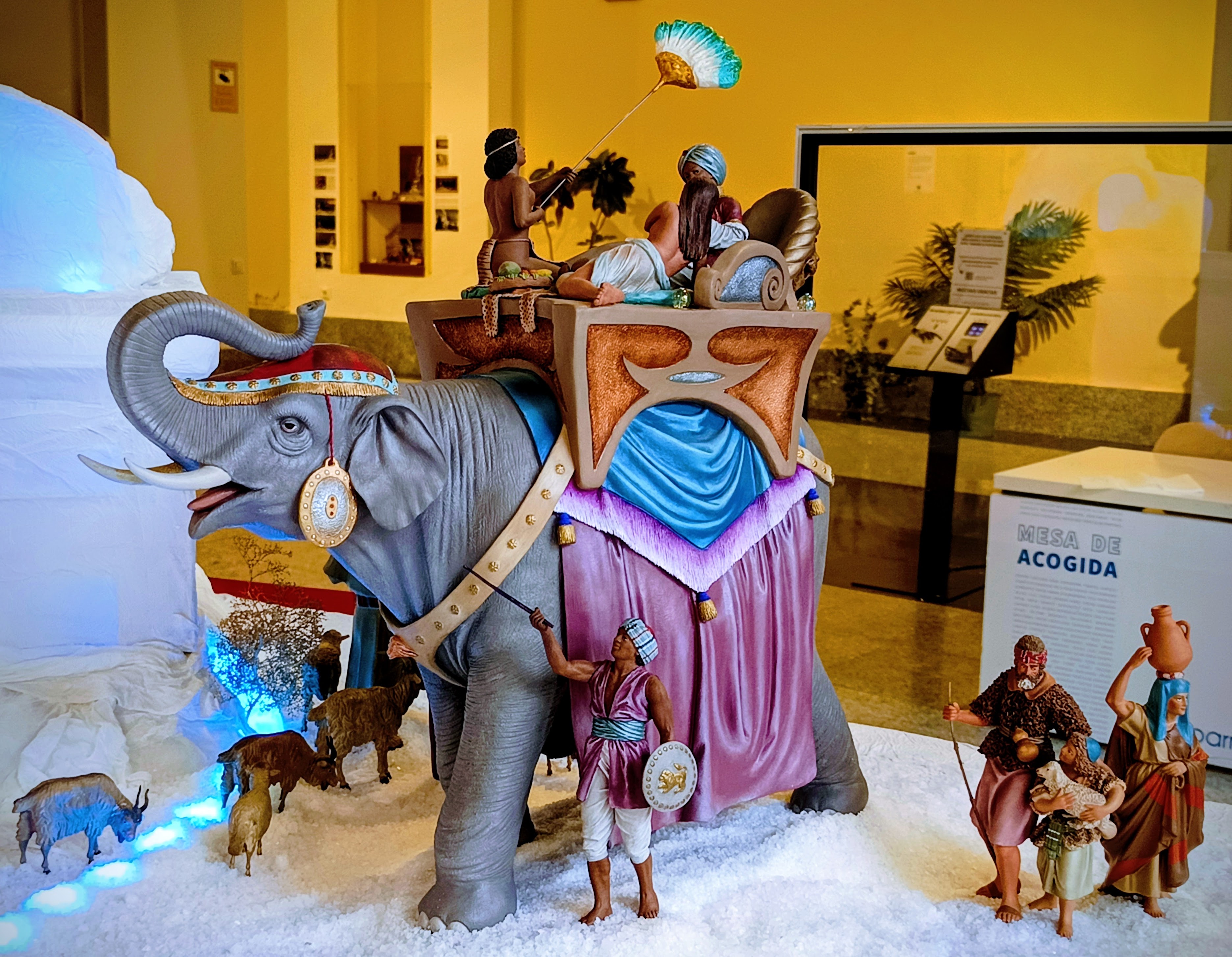 El remate de este año, además, fue casi un sueño. Un trabajo de equipo en el sentido más natural del término. Aprovechando que Javi traía las figuras principales y que había que trasladar la excepcional —y muy pesada— Cabalgata de Daniel J. Pons, contamos con la inestimable ayuda de Gustavo, que trajo con tino y delicadeza los cerca de veinte kilos del elefante de Baltasar, incluidos este y sus odaliscas. Entre todos, de manera práctica y a la vez intuitiva, organizamos las figuras en el cuadro ampliado de Merson. Bastaron dos o tres intentos para que todo encajara y el resultado quedara, como ya conocéis, perfecto.