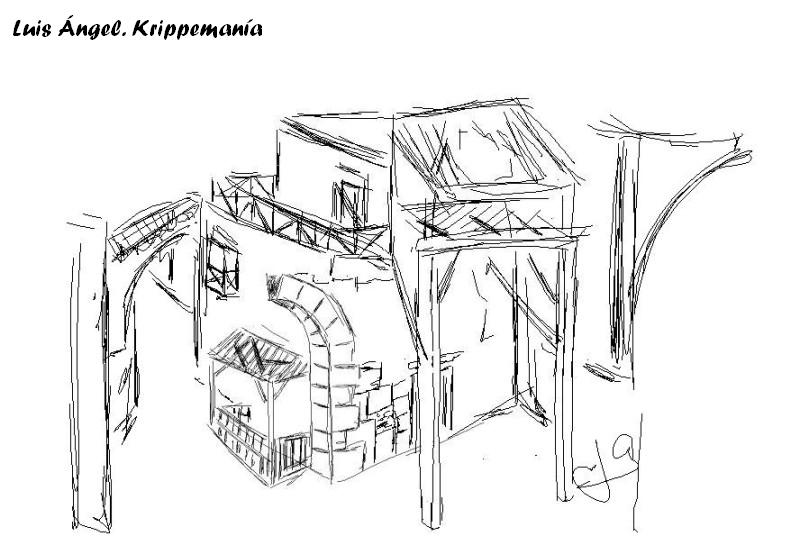 Aunque yo no dibujo muy bien, y menos con el ordenador, he esbozado un pequeño boceto de lo que pretendo construir. Se trata de una edificación de planta cuadrada, semiderruida, con un establo para el buey en su lado izquierdo y un porche/cobertizo en la fachada que albergará la escena del Nacimiento.