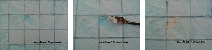 Para obtener el aspecto rugoso de la piedra utilizaremos una técnica diferente: DISOLVENTE. Utilizaremos un disolvente común, preferentemente sin olor y procuraremos trabajar en un lugar bien ventilado. Cogeremos un pincel plano o espátula y lo mojaremos en el disolvente, escurriendo la mayor cantidad del producto y, seguidamente, daremos leves pasadas sobre las piedras, una a una y en sentidos diferentes para evitar que queden demasiado iguales. Habremos de procurar que no caiga ninguna gota de disolvente sobre el trabajo ya que nos haría un agujero aunque esto también tiene arreglo. Cuando se le coge la práctica al disolvente el trabajo se hace muy rápido. Después de esto, con una lija de grano medio, redondearemos las aristas de las piedras. Podemos ayudarnos también de un minitaladro con accesorio lijador a baja velocidad.
