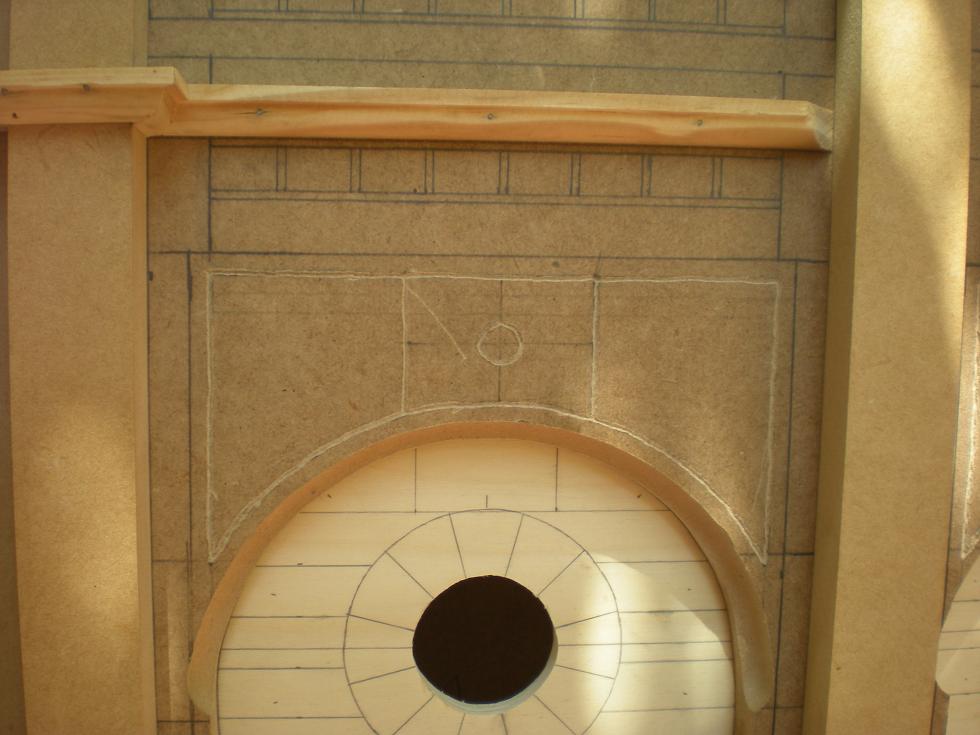 Mas fotos. La parte baja de la cornisa de la fachada ya está terminada. Ahora queda la parte superior. Por otro lado, ya he cerrado también uno de los laterales. En las ventanas y los rosetones quiere poner vidrieras, y las haré con trozos de metacrilato pintados con laca de bombillas.