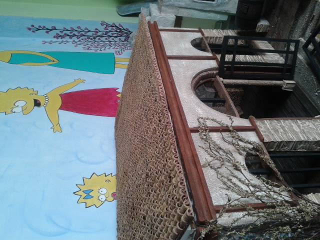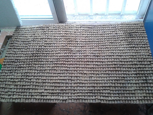 muchas gracias a todos Pati, Vicente, Hellen, barbara,Carlos y riera.....aqui os dejo las tejas ya pegadas..... mas o menos he contado 1950.Despues de darle una pequeña capa de color marrón aguado...le he dado otra capa de cola y le he echado arena por encima muy finita...Ahora solo me queda pintar ya subire fotos.