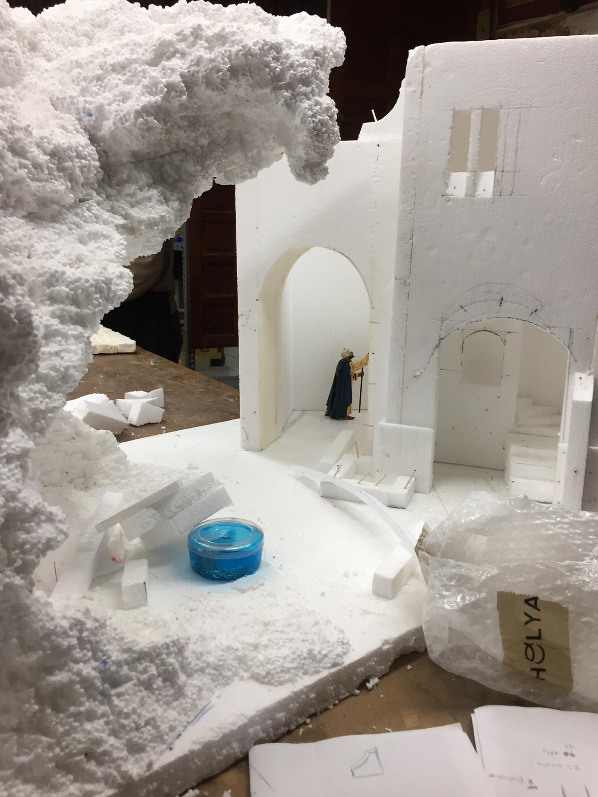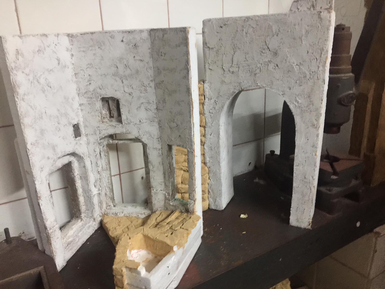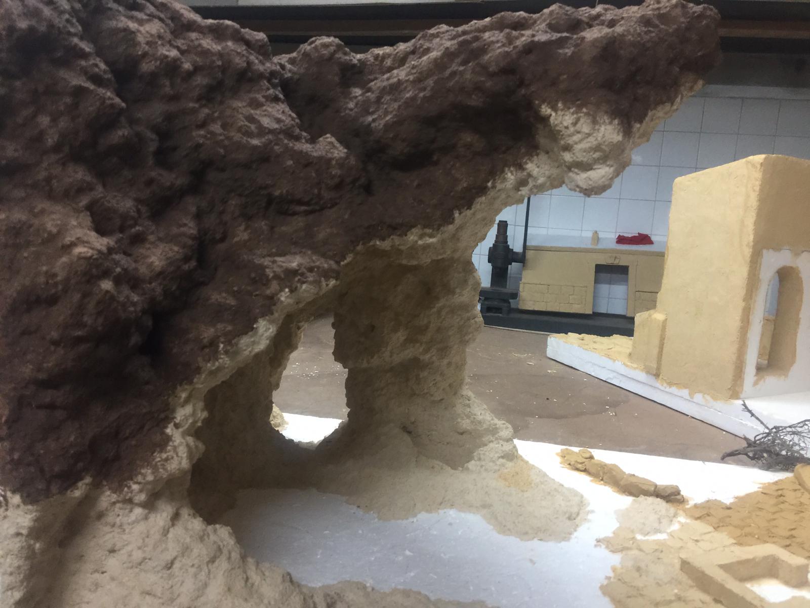 Pues, es una técnica aprendida del Escenógrafo y Belenista José Cruz Ruiz. En líneas generales tiene cola, agua, alguna pasta de construcción y arena. Todo mezclado y aplicado en una o dos capas. Luego a pintar.