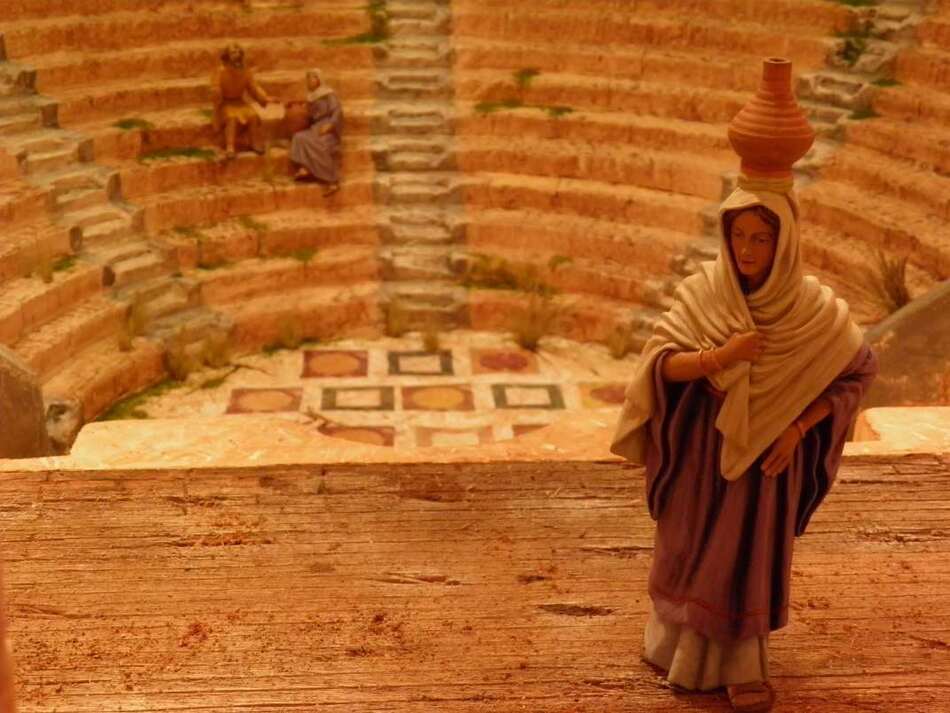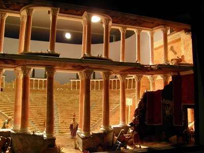 El nacimiento se encuentra en la parte de atrás del escenario y frente escenico, compuesto de doble orden de columnas 48 en total, con pinturas murales en la paredes originales de yacimientos en Cartagena (Domus de la Fortuna), techos decorados, mosaicos y un graderío cerrando la escena tal y como se cree que existÍa en Carthago Nova. Si visitais nuestra tierra no dejeis de ver el teatro Romano de Cartagena es una maravilla.
