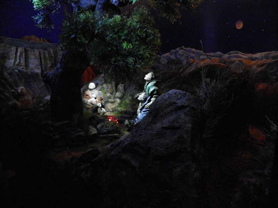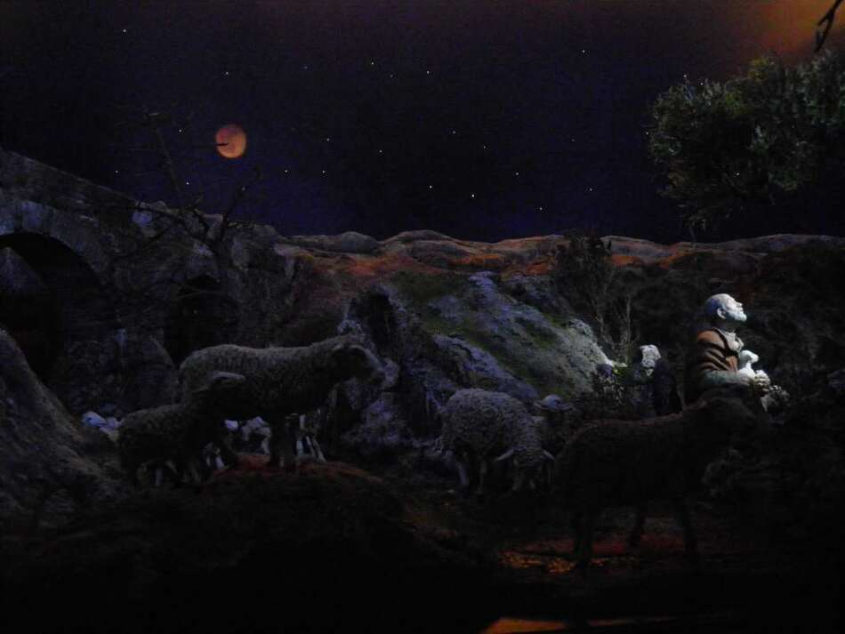 La otra escena, se centra en la anunciación a los pastores sobre la rambla de nuestra localidad, Fuente Álamo. En ella, se ha representado la anunciación a los pastores. Decir que el acueducto que hay a la izquierda también existe en una pedania llamada El Estrecho, situada muy cerca de nuestro pueblo. El arbol es de una encina centenaria que mi mujer fotografió cerca del pueblo que nació su madre en Caravaca de la Cruz, este ultimo lo realizó nuestro amigo David del Albujón que nos dió una gran sorpresa pues al ver la fotografía no tardó en realizar el árbol y como es experto en iluminación pues hizo realidad nuestra idea de que iluminase a los pastores la luz del angel.