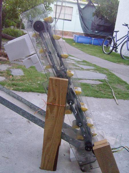 Con una goma creamos una cinta transportadora a la cual le adaptamos trozos de media caña que tendrán la función de palas.