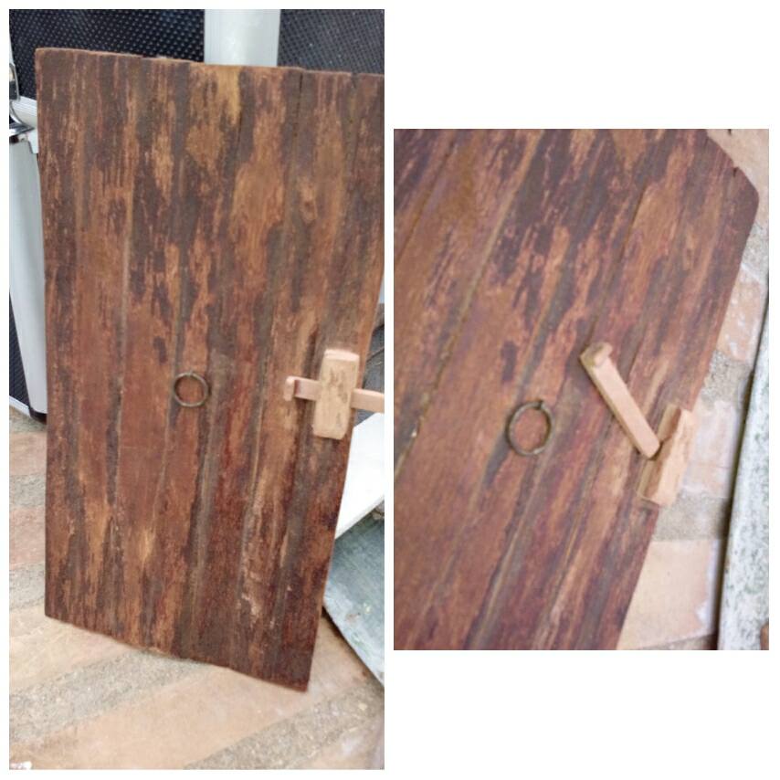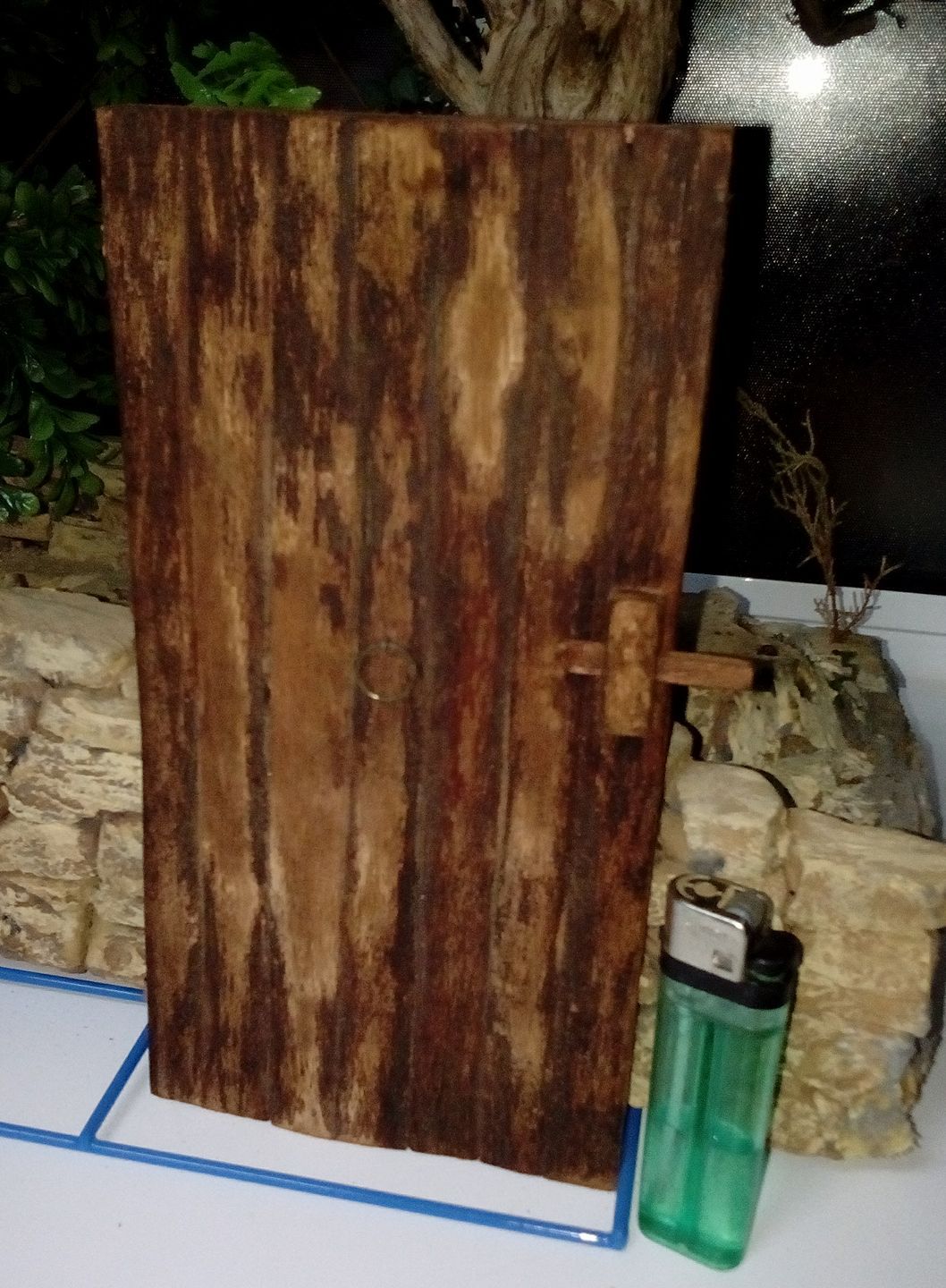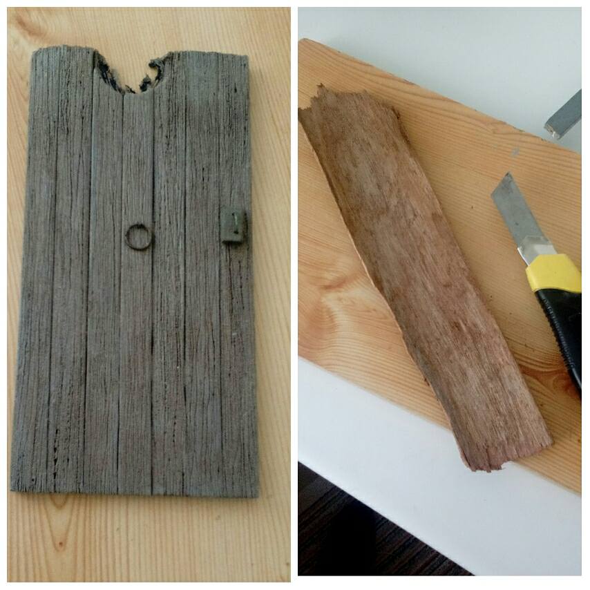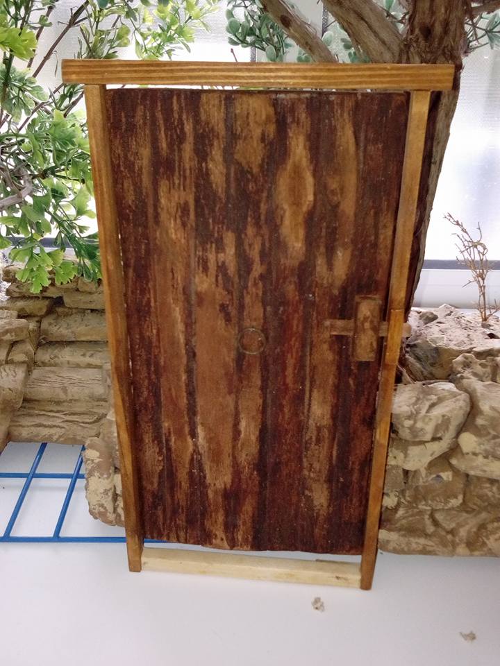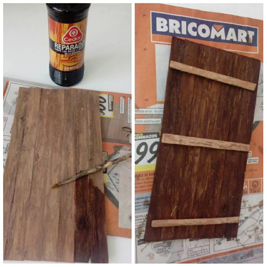 Para sustituir una puerta de poliestireno que se quemó con una bombilla durante el desmontaje de este año. Está realizada con corteza de eucalipto para figuras de 20 cm