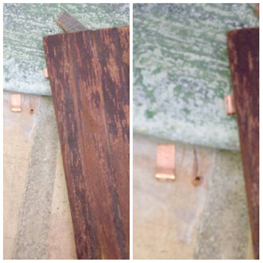 Las bisagras están hechas con lámina de cobre que enrollamos en torno a un clavo y para que mantuvieran la forma fuimos pegándolo con locktite. Esas láminas se usan en los cables eléctricos de Media Tensión.