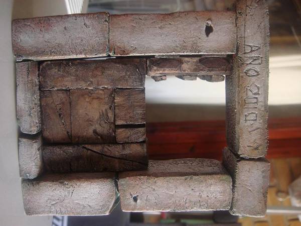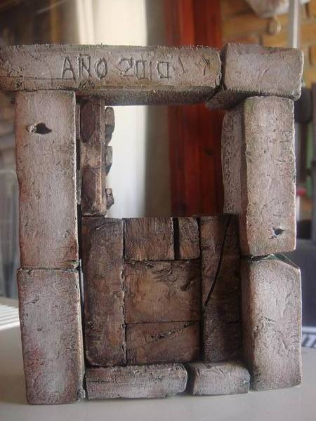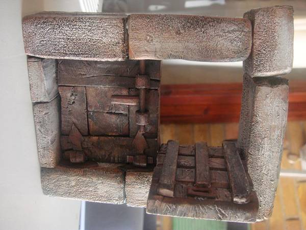 La puerta es de porex, moldeada a cuter, no ligarla. Pintada con nogalina, varias manos. Dejar secar los charcos de nogalina que resbalan por el porex.