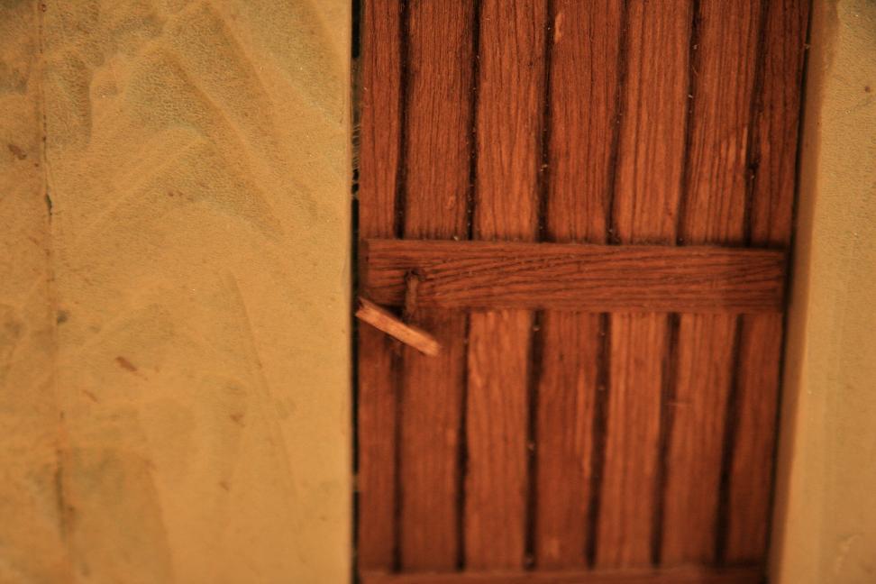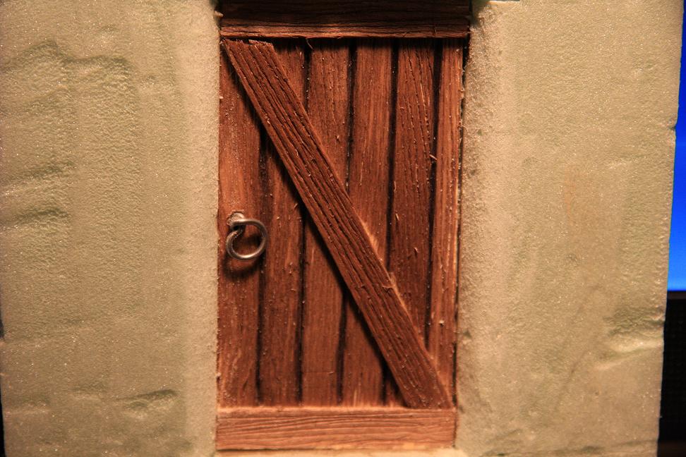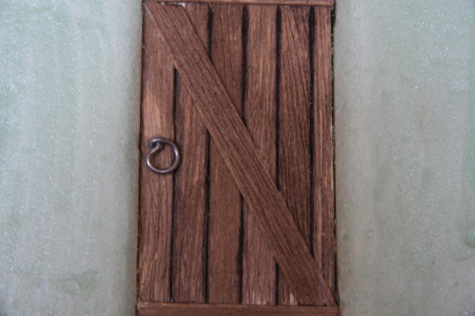 En total hay tres puertas, todas hechas de la misma manera pero con abridores diferentes. He utilizado el porex del vaciado del hueco, para, rebajao a la mitad +-, pegar sobre él los palitos de polo rallados.