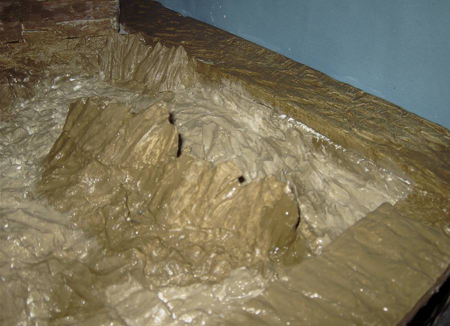Ahuecar nuestras planchas de porex con soldador y too a base de cutter dándole la forma deseada, pegar dichas planchas con Ceys poliestireno expandido y too los recortes que nos servir y vayamos a utilizar... con el soldador too le haremos más vetas a dichos recortes...