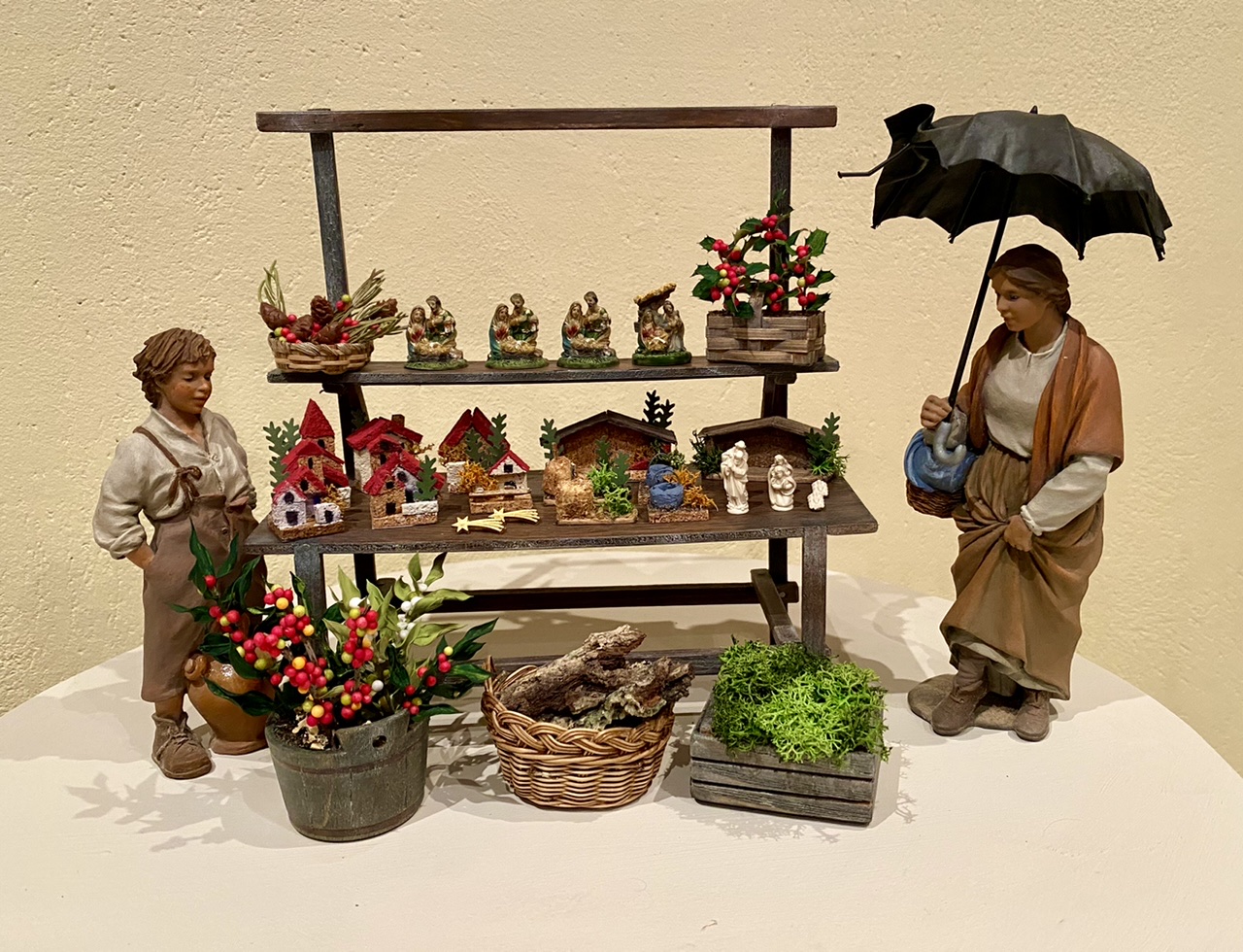 Bueno, parecía que este año no conseguía inspirarme para hacer algo nuevo, pero al final sí. Es un puesto de figuritas y adornos para el belén. Excepto las figuritas que son de resina y plástico y las compré, lo demás está hecho por mí ( bueno, las mesas de los puestos me las hace mi padre, en madera). Las casitas están hechas con trocitos de láminas de corcho y el acebo con ramitas de encina seca pintadas y bolitas de porexpan de colores, las piñas son de cera coloreada pegadas en ramitas de romero. Las figuras, de Montserrat Ribes, no son las que van a ir en la escena, pero serán de la misma medida y colección.