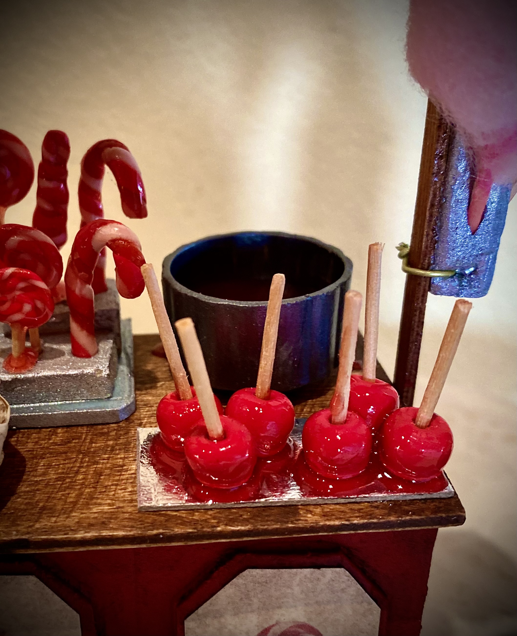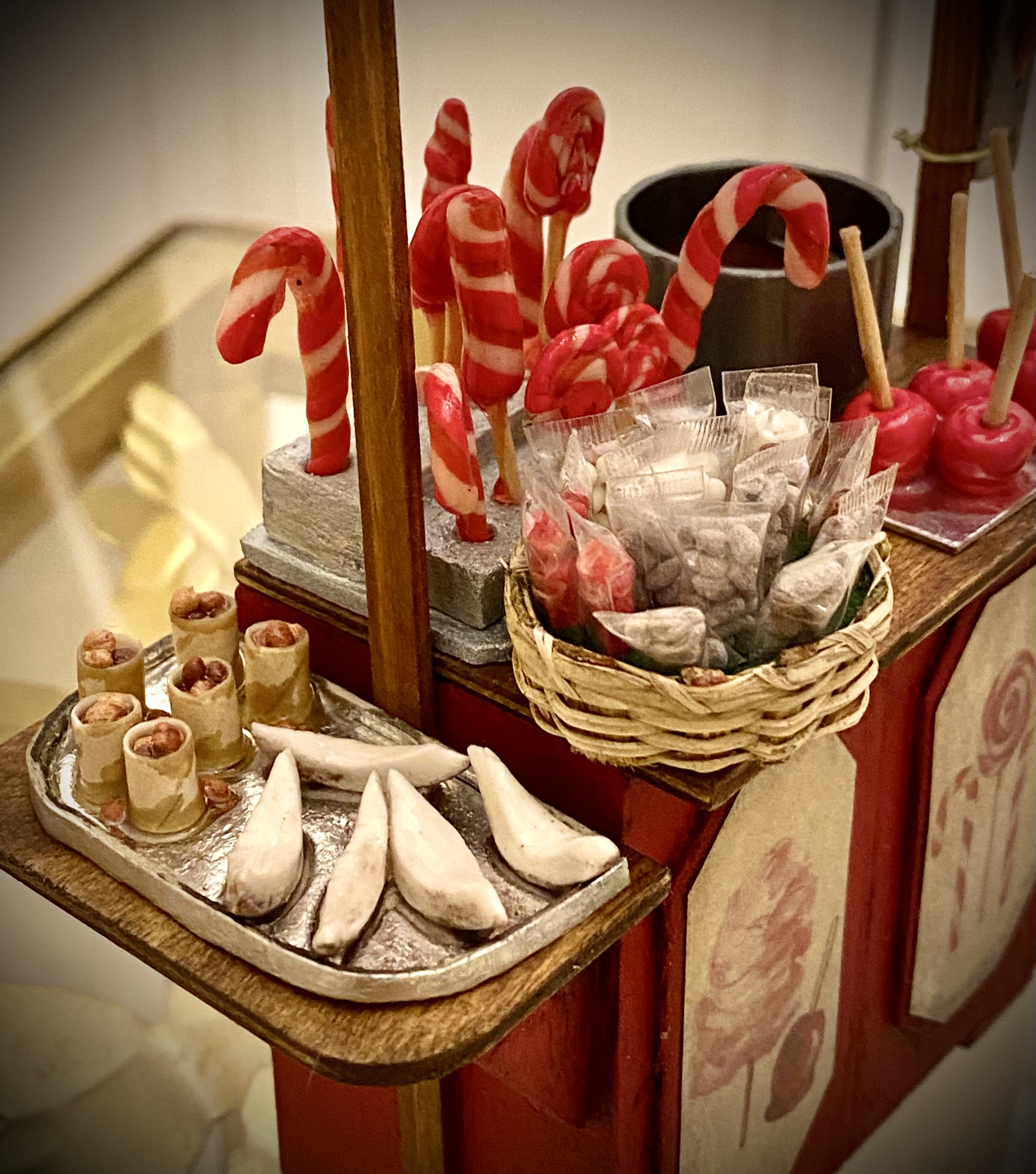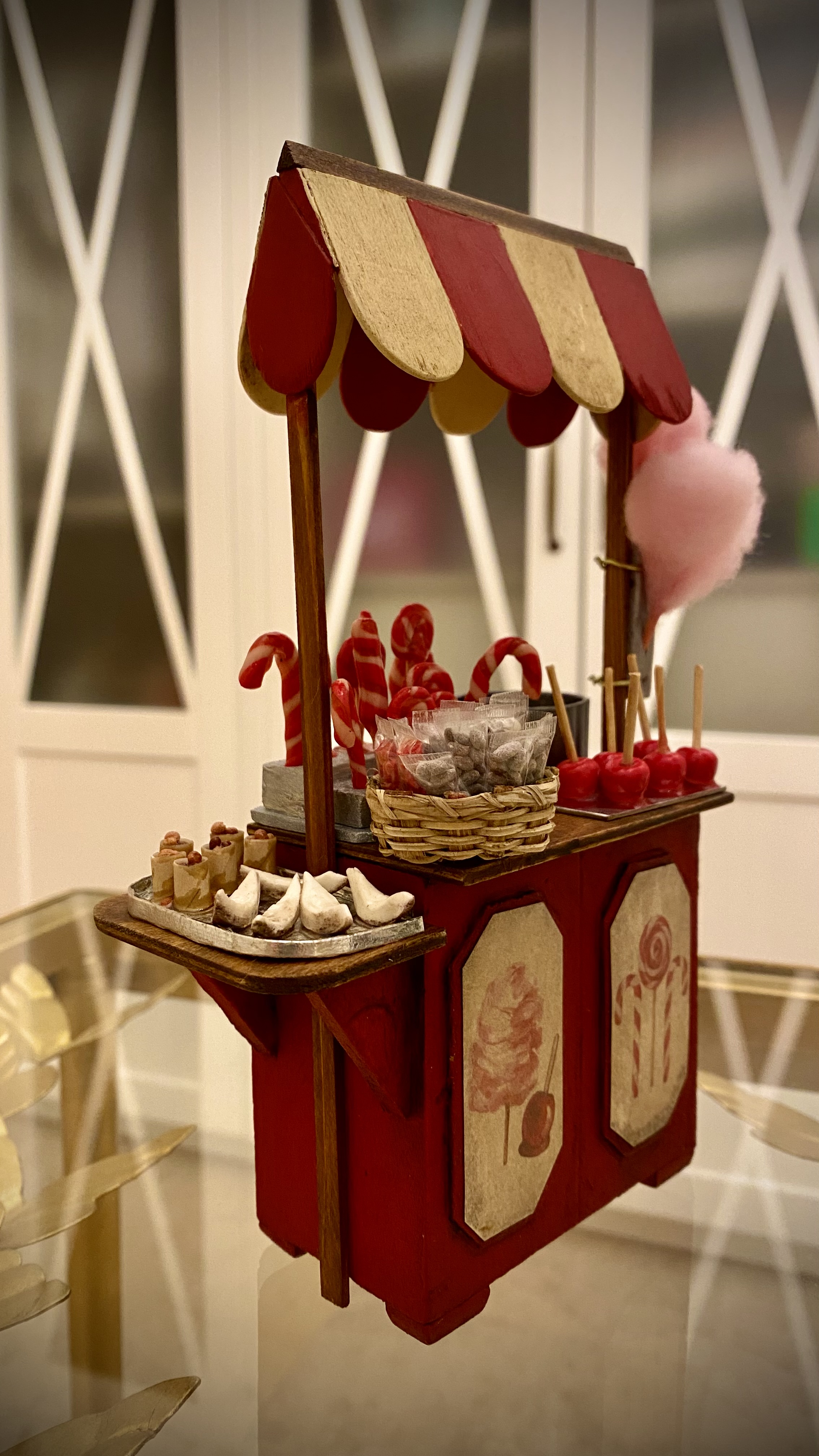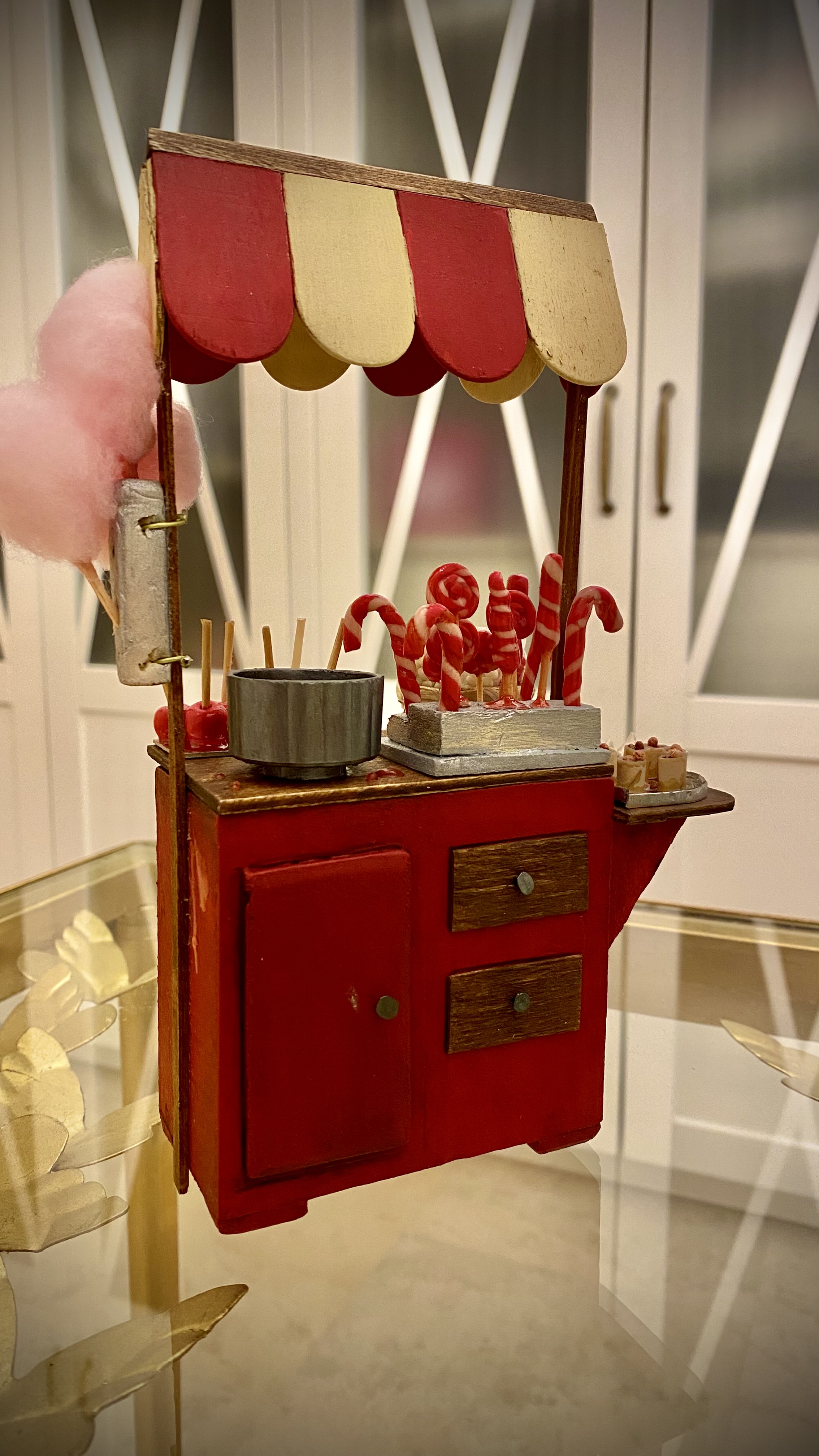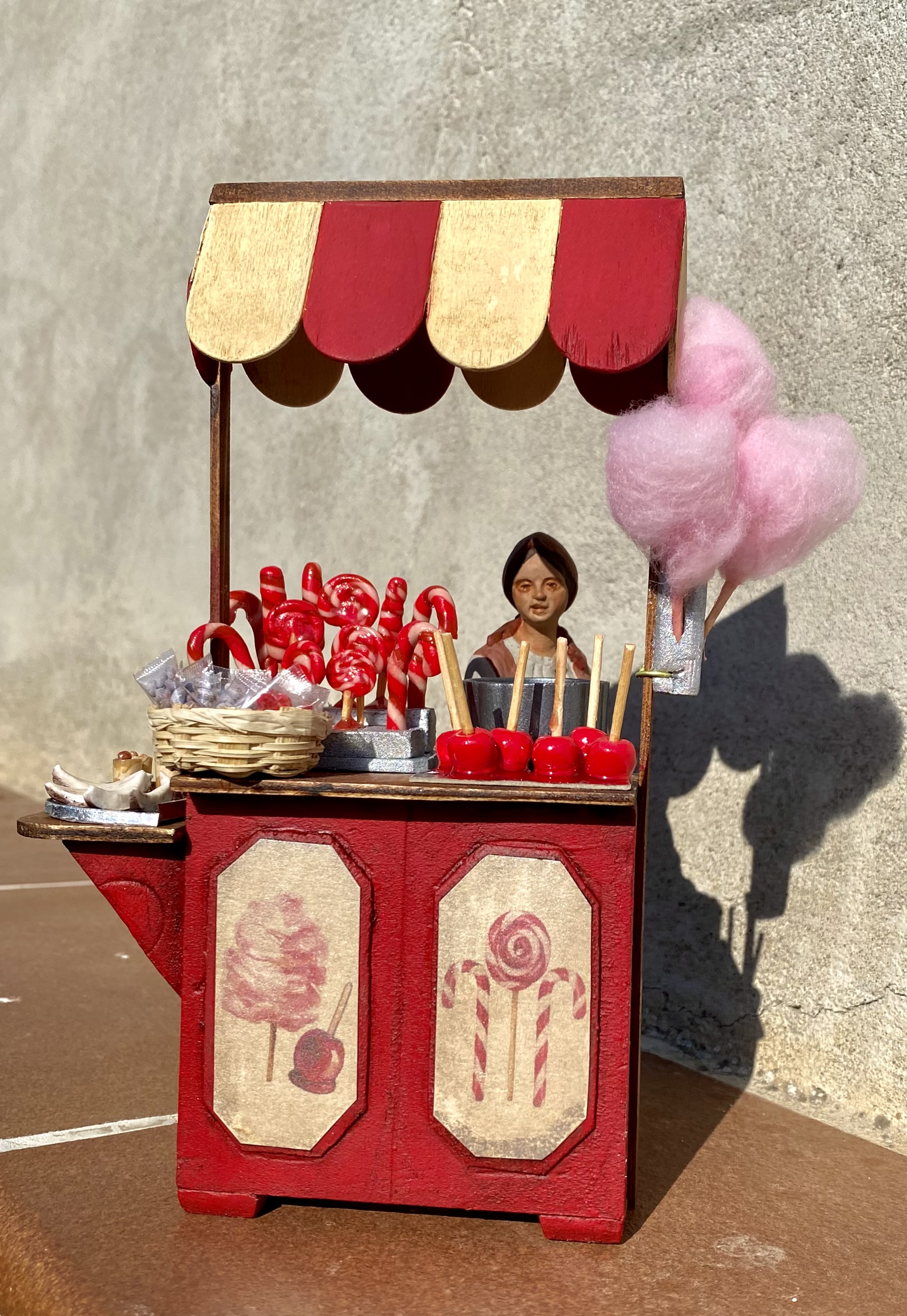 Se trata de un puesto de dulces, caramelos y algodón de azúcar. El mostrador está hecho de poliestireno y madera y los dulces son de arcilla polimérica.