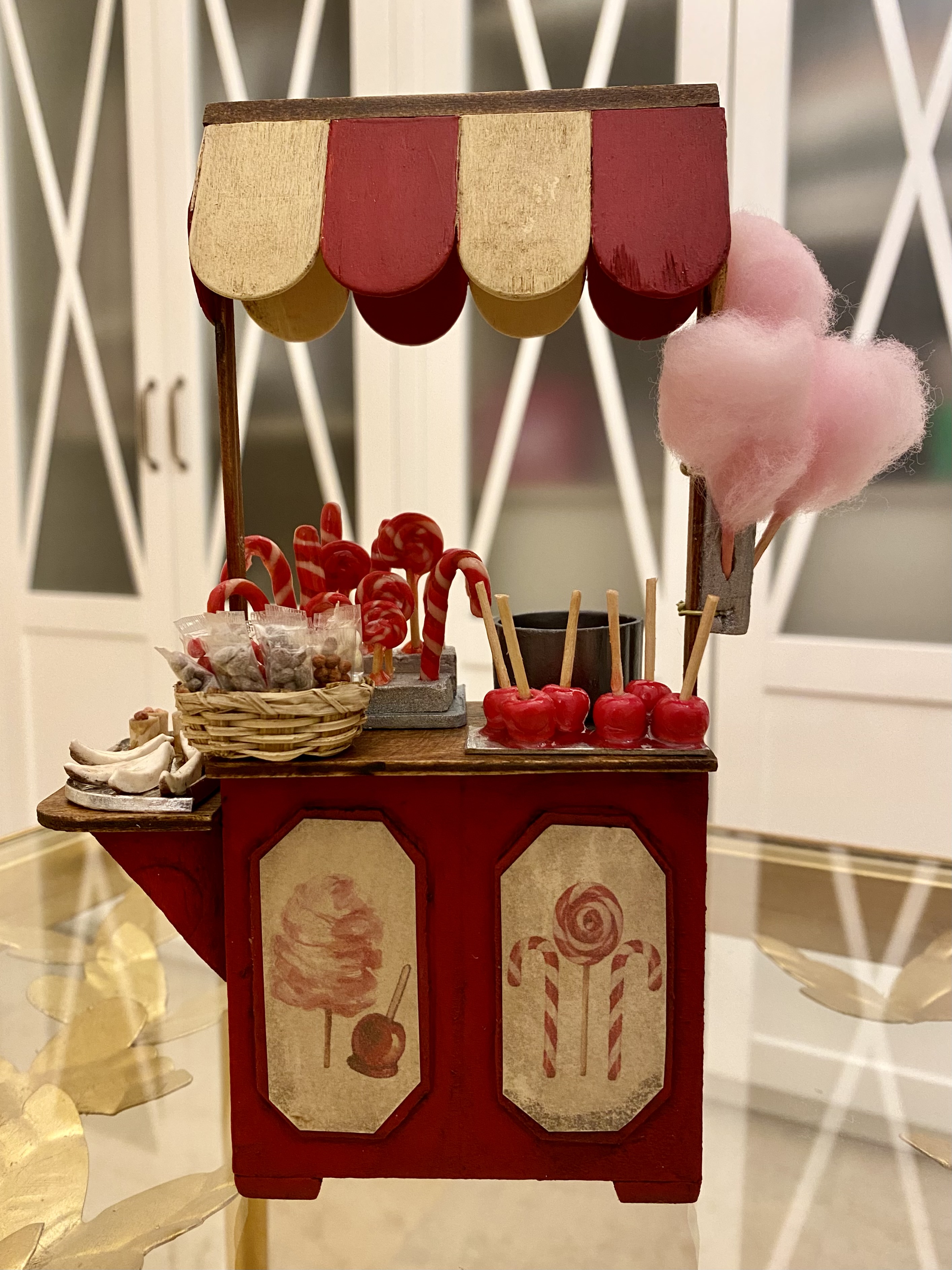 Se trata de un puesto de dulces, caramelos y algodón de azúcar. El mostrador está hecho de poliestireno y madera y los dulces son de arcilla polimérica.