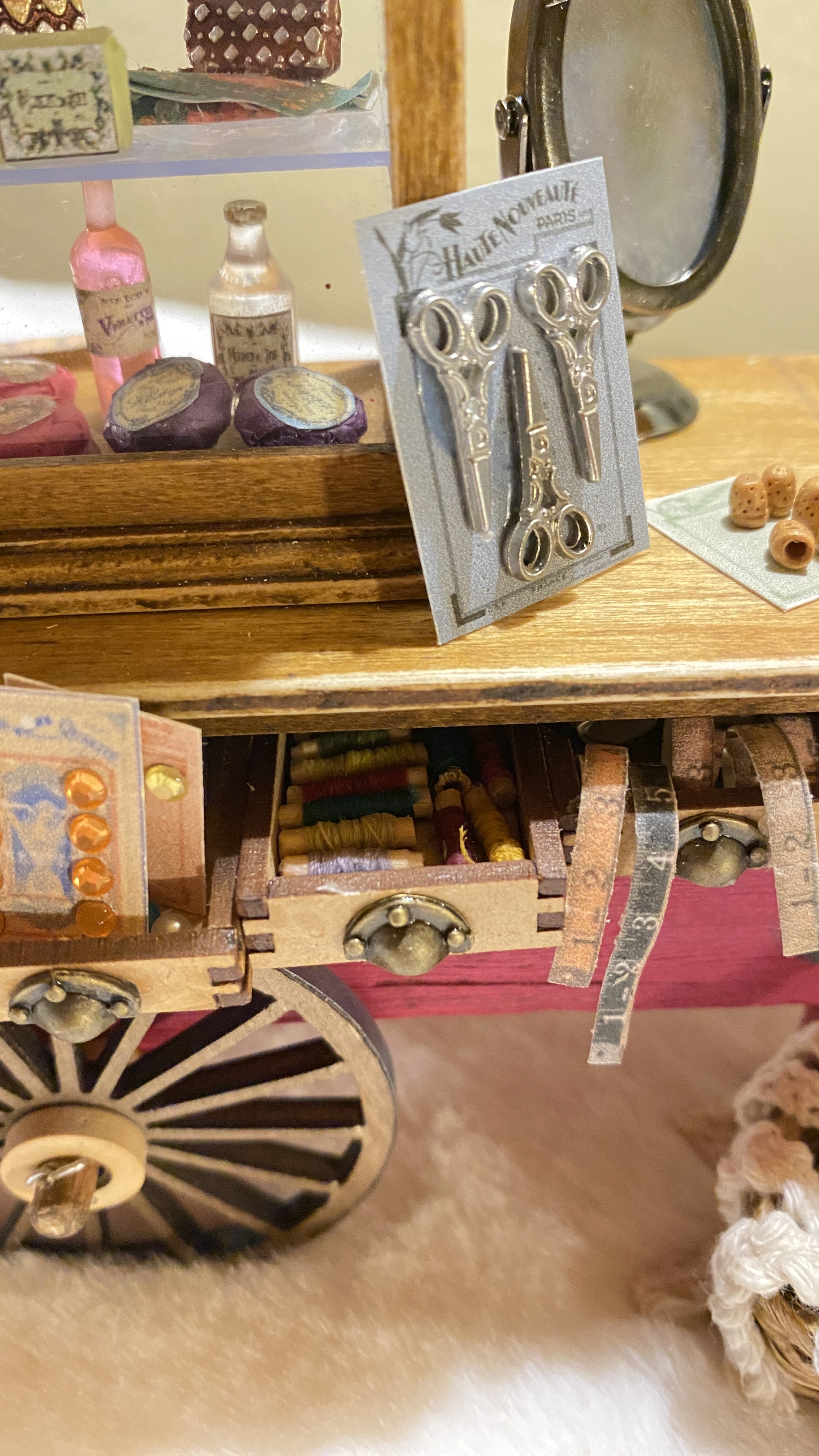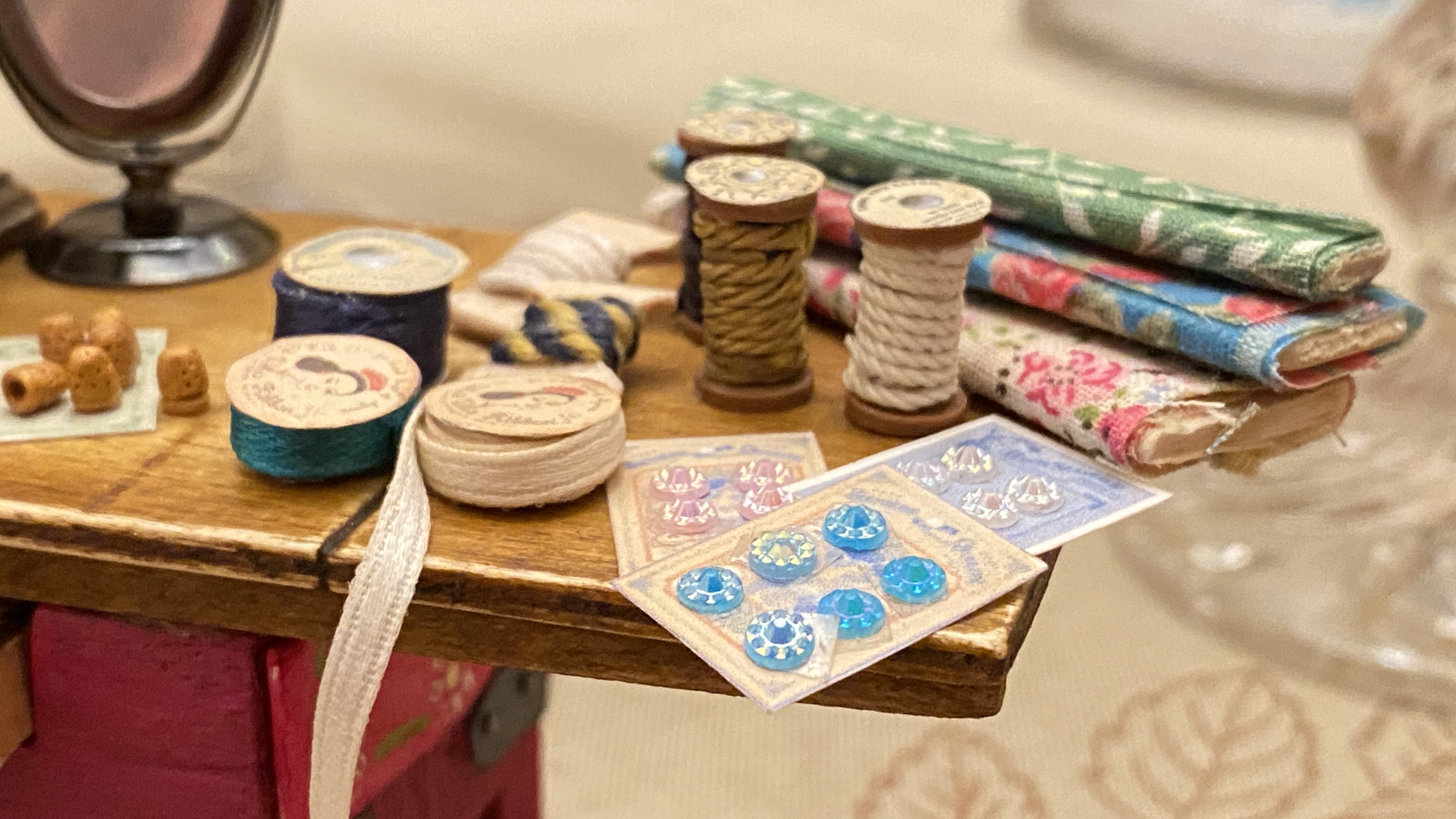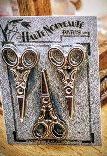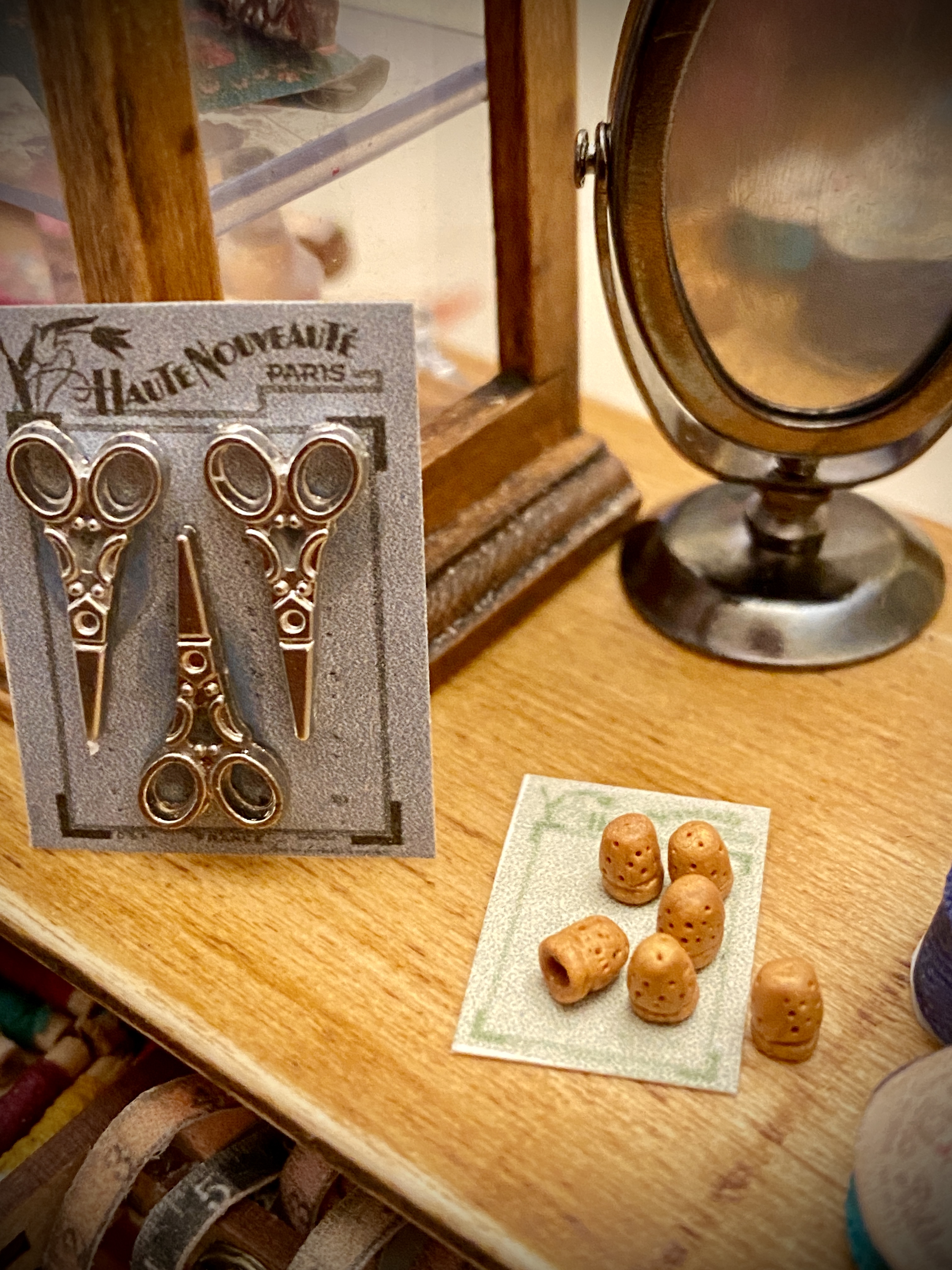 Me preguntas por los cartones de los botones y de las tijeras. Estos concretamente los encontré en Pinterest, eran de tamaño real, los descargué y los reduje de tamaño, les he cambiado el color y así he hecho unos cuantos diferentes. Los imprimes en una hoja de papel de dibujo, un poco rugoso y de color beige y así aparecen antiguos de verdad. Las tijeritas son de metal, las he comprado en una tienda de miniaturas. Los botones son brillantitos, de estos que se usan para hacer manualidades, he usado los más pequeños que encontré.