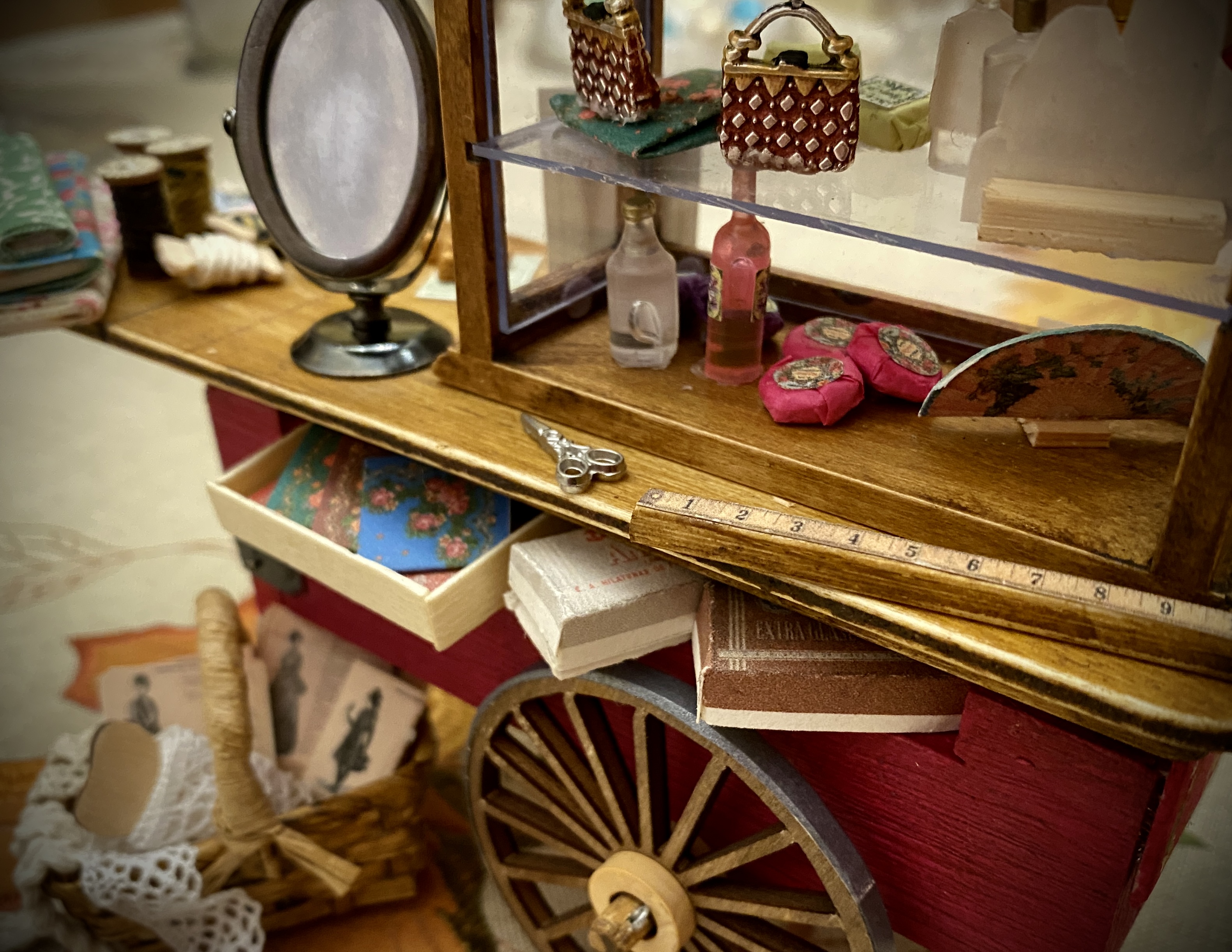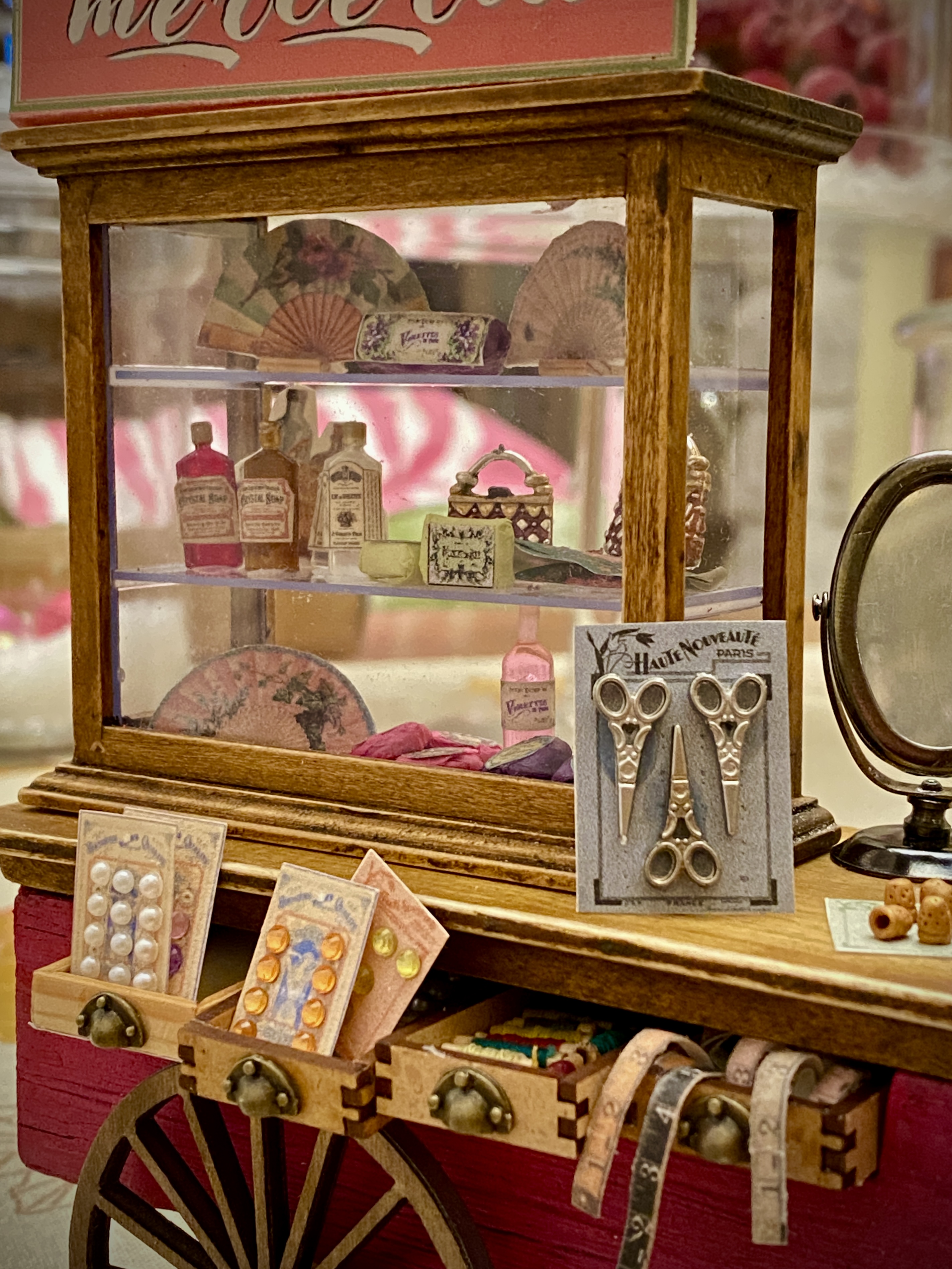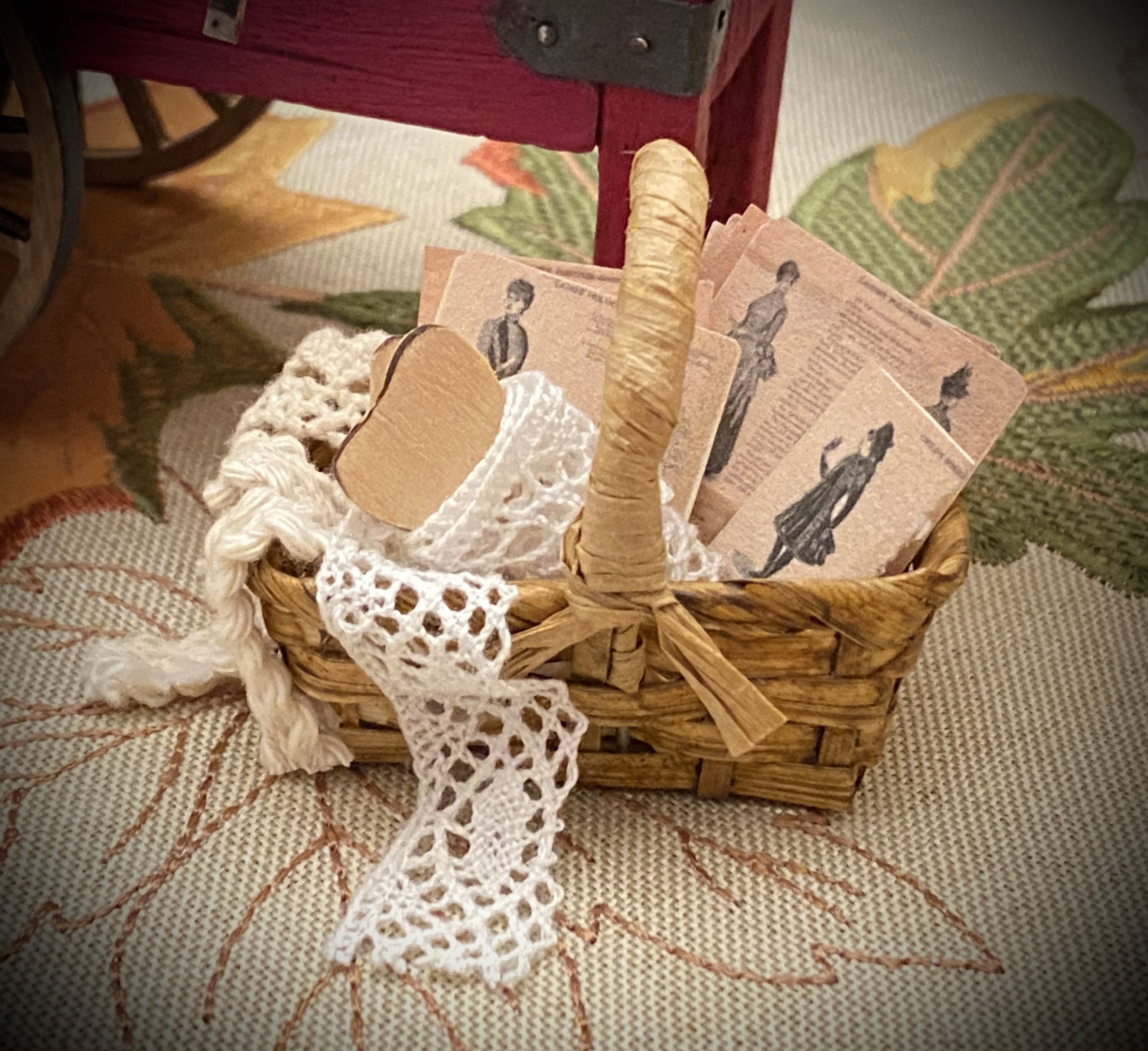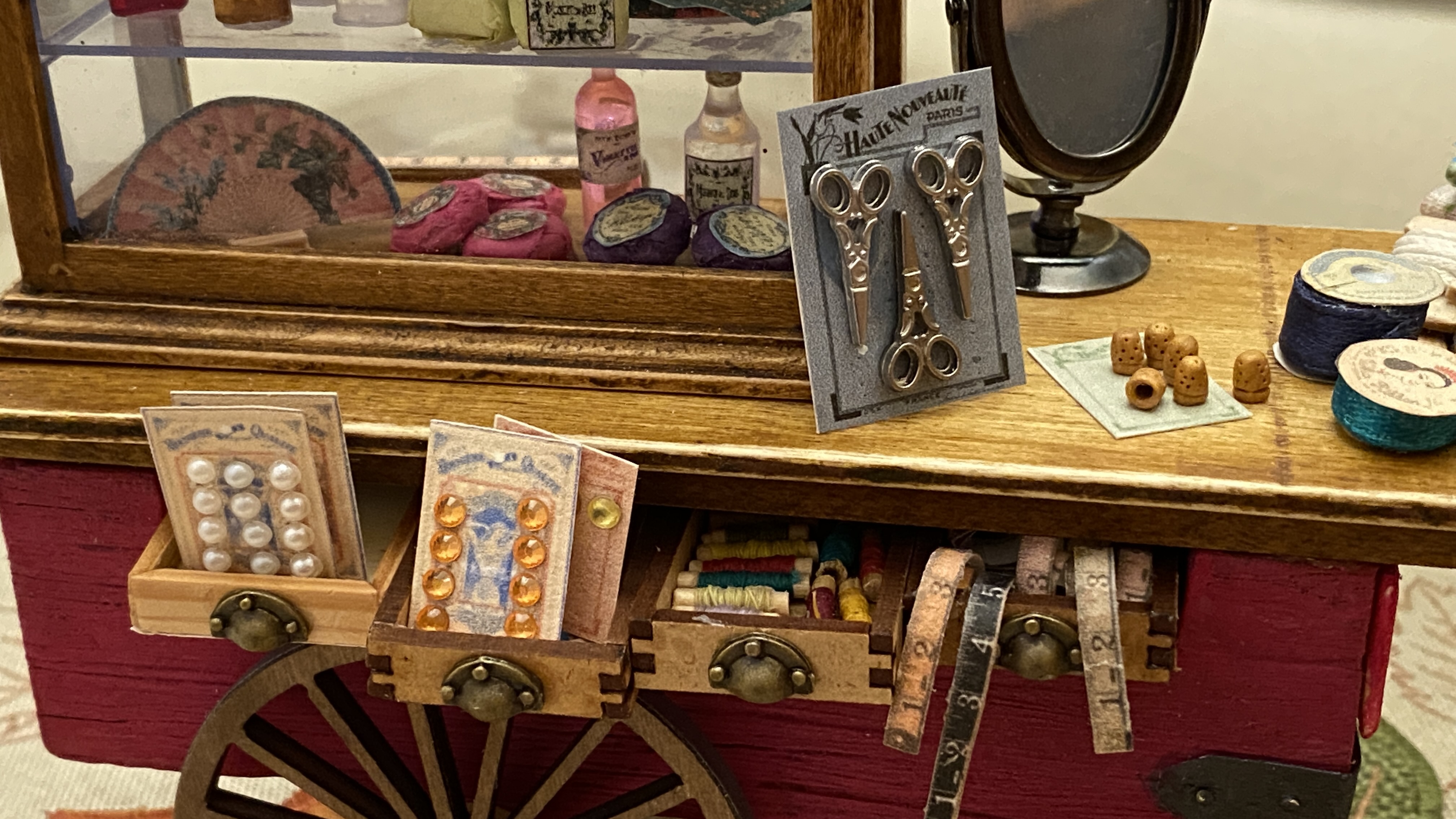Me preguntas por los cartones de los botones y de las tijeras. Estos concretamente los encontré en Pinterest, eran de tamaño real, los descargué y los reduje de tamaño, les he cambiado el color y así he hecho unos cuantos diferentes. Los imprimes en una hoja de papel de dibujo, un poco rugoso y de color beige y así aparecen antiguos de verdad. Las tijeritas son de metal, las he comprado en una tienda de miniaturas. Los botones son brillantitos, de estos que se usan para hacer manualidades, he usado los más pequeños que encontré.