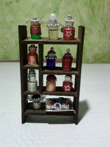 es muy sencillo.... de momento solo he hecho la estanteria y las botellitas....estan hechas con tubitos de cristal y cuentas de collares. SALUDOS