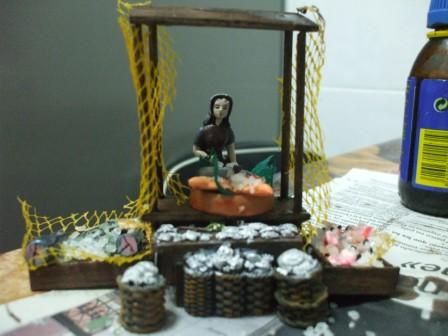 Os dejo para que me déis vuestra opinión, un puesto de pescado que acabo de realizar. Las gambas y los peces están hechos con fimo (es mi primer trabajo con esta pasta) y el hielo es sal gruesa.