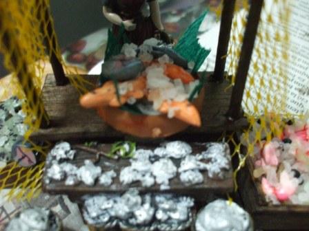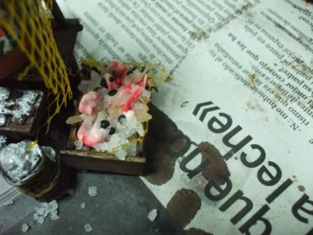 Os dejo para que me déis vuestra opinión, un puesto de pescado que acabo de realizar. Las gambas y los peces están hechos con fimo (es mi primer trabajo con esta pasta) y el hielo es sal gruesa.