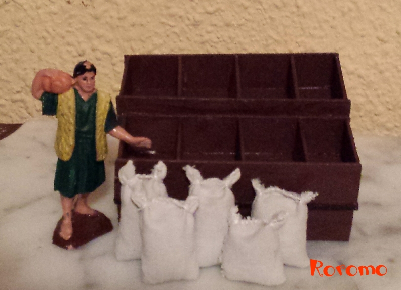 Espero ver tu trabajo, por cierto, enseña el pastorcillo pintado, creo que te va ideal para ese puesto al llevar un saco en su hombro. Ciertamente se le puede sacar mucho partido a las figuritas de los chinos, en cuanto a su pintado son horribles, pero una vez que se lo quitas y las pintas tú, se quedan estupendas, pues las figuras en sí están muy bien hechas; la tuya no está mal pintada, pero hay por ahí otras de un color gris oscuro y con los colores movidos que dan pena. Como yo digo son patitos feos que con un poco de paciencia se convierten en cisnes.