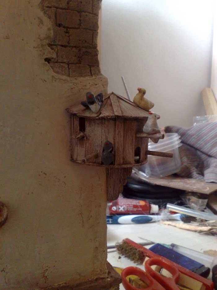 Hola Fernando el balcón, la puerta y el palomar son de madera de balsa, y listoncillos, a mi gusto la madera es mas agradecida de trabajar que el porex, y su precio no es excesivo una tabla me dura mas de un año y vale 2 €.