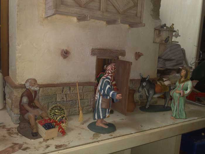 Jose las figuras del buscando posada son mías, mías me refiero a hechas por mi, la asomada al balcón es una santa Isabel de Castells y el viejete es de Mayo es un viejo calentándose en una hoguera, las medidas del proyecto rondaran el 1,2 de largo por unos 0,60 de ancho, entre el conjunto de la posada y la cueva saldrá otra pequeña cueva que estará llenita de ovejas y animalitos y si puedo unos pastores en anunciación, y al final de la montaña creare un barranco por el que entraran la cabalgata de castells con el portador de la estrella (figura mia el y el caballo), acompañado de un pastor manelic de castells con un montón de ovejitas serenas jajaja.