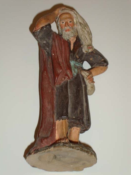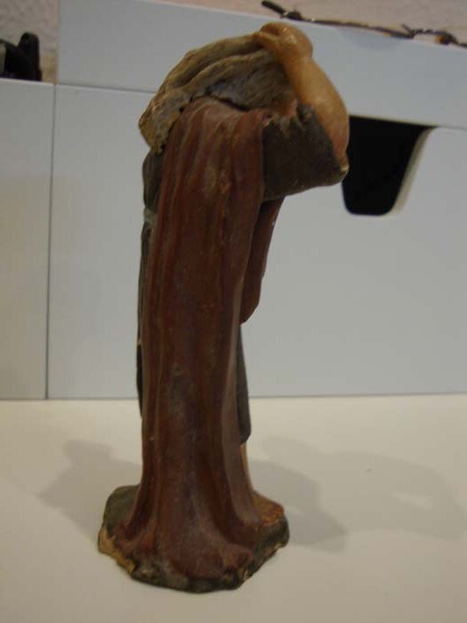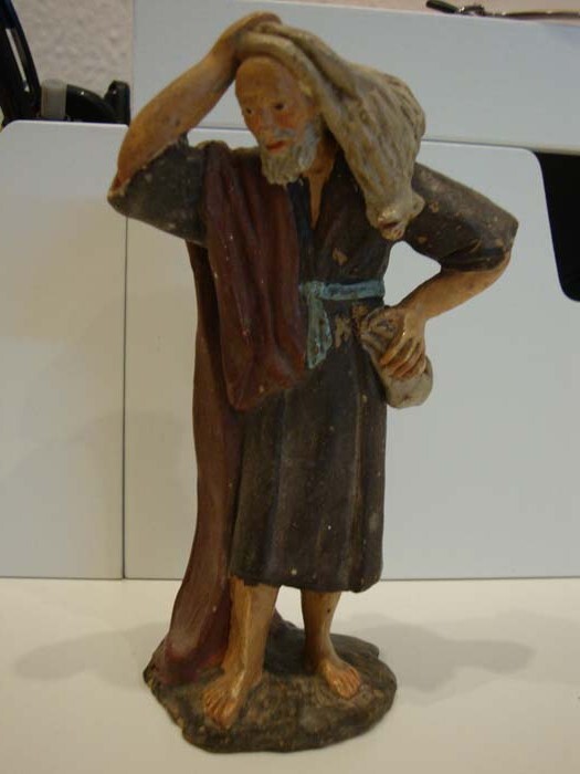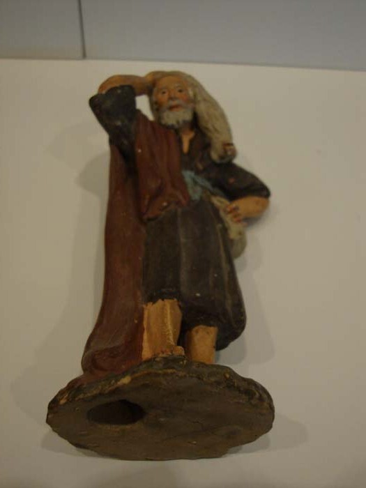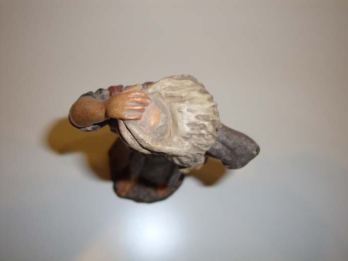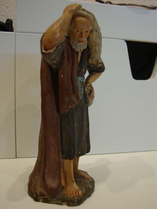 El modelado es muy bueno, la pintura ya no tanto pero para la edad que le estimo casi 100 años esta bastante bien conservada. Mide13 cm. justos que si estuviese plantada seria de 14, encaja con el estilo del pastor arrodillado de Antoni.
