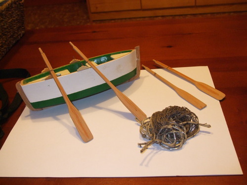 He conseguido que mi padre me hiciera una red para el puesto de pescado, y claro ya que tenía la red....... y me dejaba los remos pues...... le he requisado la barca para el belen del año próximo por que en este no pondre mar. Según el le ha costado un poco el hacerla ya que las "mallas" son muy pequeñas, pero la hizo en una horita aproximadamente. La barca y los remos también son hechos suyos. ¿Qué os parecen los detalles de mi padre?