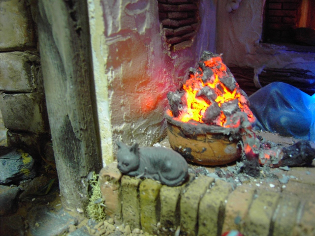 Lina, los desconchones y las piedras del arco son tallados. Los troncos caídos del fuego llevan luz independiente y eso rojo que apenas se aprecia es purpurina....y ya sabes, puedes preguntar lo que quieras, para mí no hay nada imposible, lo que no sé lo dejo sin contestar, jeje, bueno, es broma.