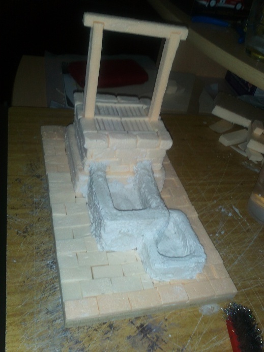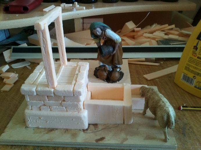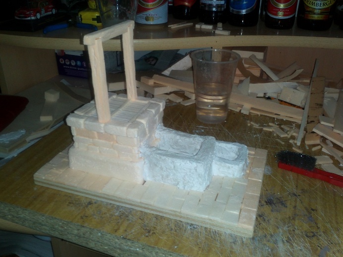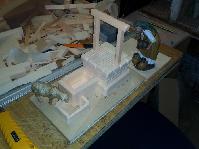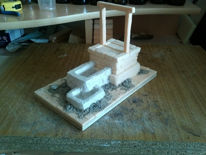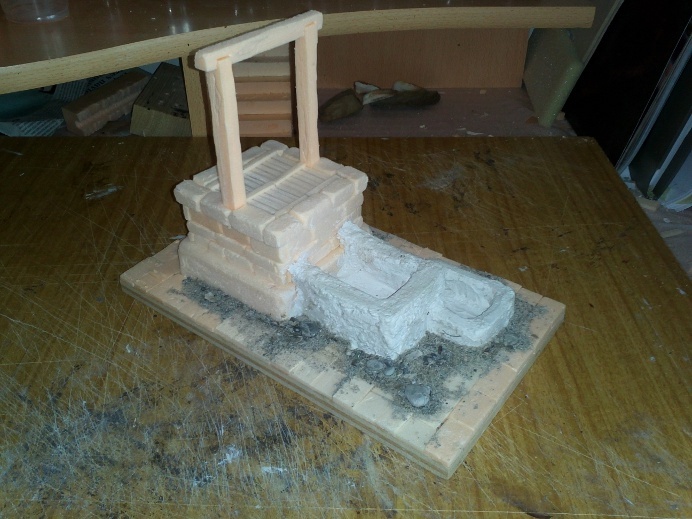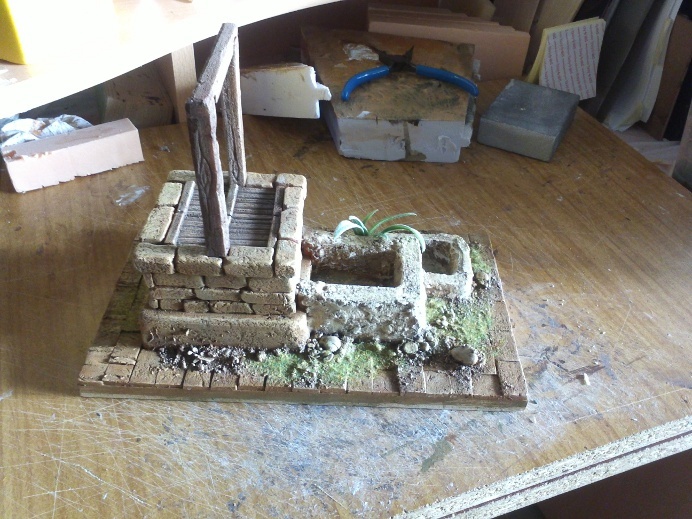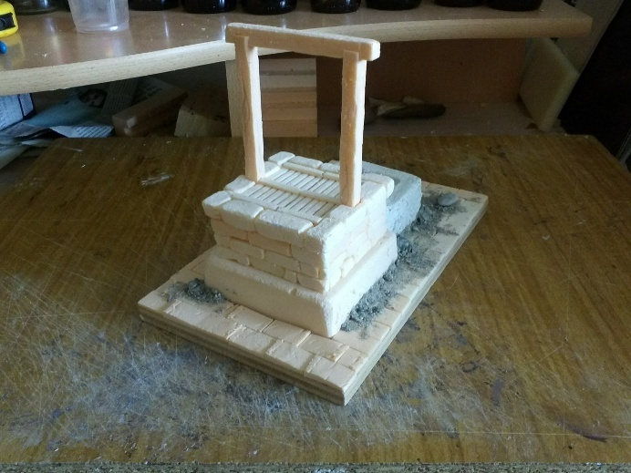 Una vez terminado tanto el pozo, puesto el yeso y pavimentado el suelo, procedo a espolvorear gravilla para simular tierra y rocas.