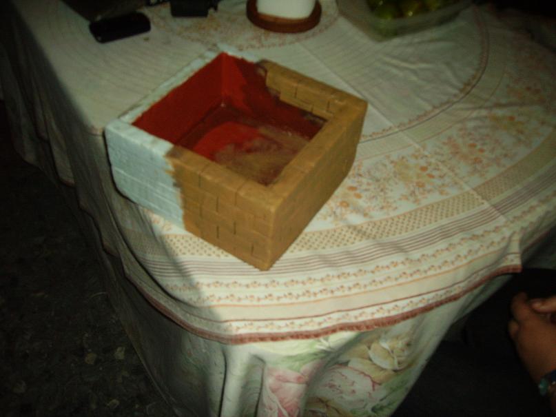 Como ya tengo mucho trabajo adelantado, os diré que he realizado un pequeño recipiente cuadrado con planchas de poliestireno extruido, pegando las piezas con cola blanca de carpintero. Por la parte interior, para sellar las juntas e impermeabilizarlo un poco, he applicado una masilla para juntas, extendiéndola con los dedos para que penetrara bien los huecos. Esta operación la repetiré varias veces, para asegurarme que no me ocurre lo mismo del año pasado, cuando observé con terror que el agua se salía a falta de unas horas para que el jurado visitara mi casa.