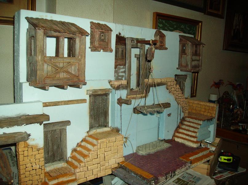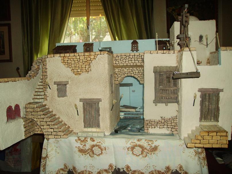 Bueno, pues esto ya esta solo a falta de darle la escayola y terminar de ponerle las antorchas necesarias.También tengo que terminar el interior de la tienda de antigüedades, que lo voy a hacer con jeroglíficos, y el suelo de delante de la tienda, que le voy a hacer un embaldosado que he visto en el foro, del compañero Enrique Fernández, de Jerez; espero que no le importe. Aquí os dejo las fotos de hoy: la pintura terminada, un adelanto de como irían algunos de los artículos en la tienda de antigüedades, y el suelo del belén de Enrique que quiero imitar. Espero vuestros comentarios.