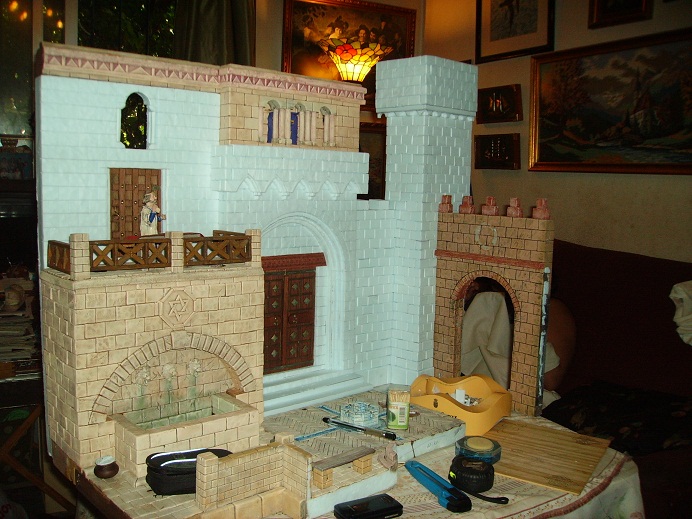 Ahora estoy liado con la torre de la puerta. Le estoy pegando los ladrillos uno a uno, para que quede con más relieve. Es un trabajo arduo y pesado, pero el resultado final es mucho mejor que tallándolo directamente. Y ya he realizado la parte superior de la torre. En cuanto lo tenga terminado os pongo las fotos para que lo veais